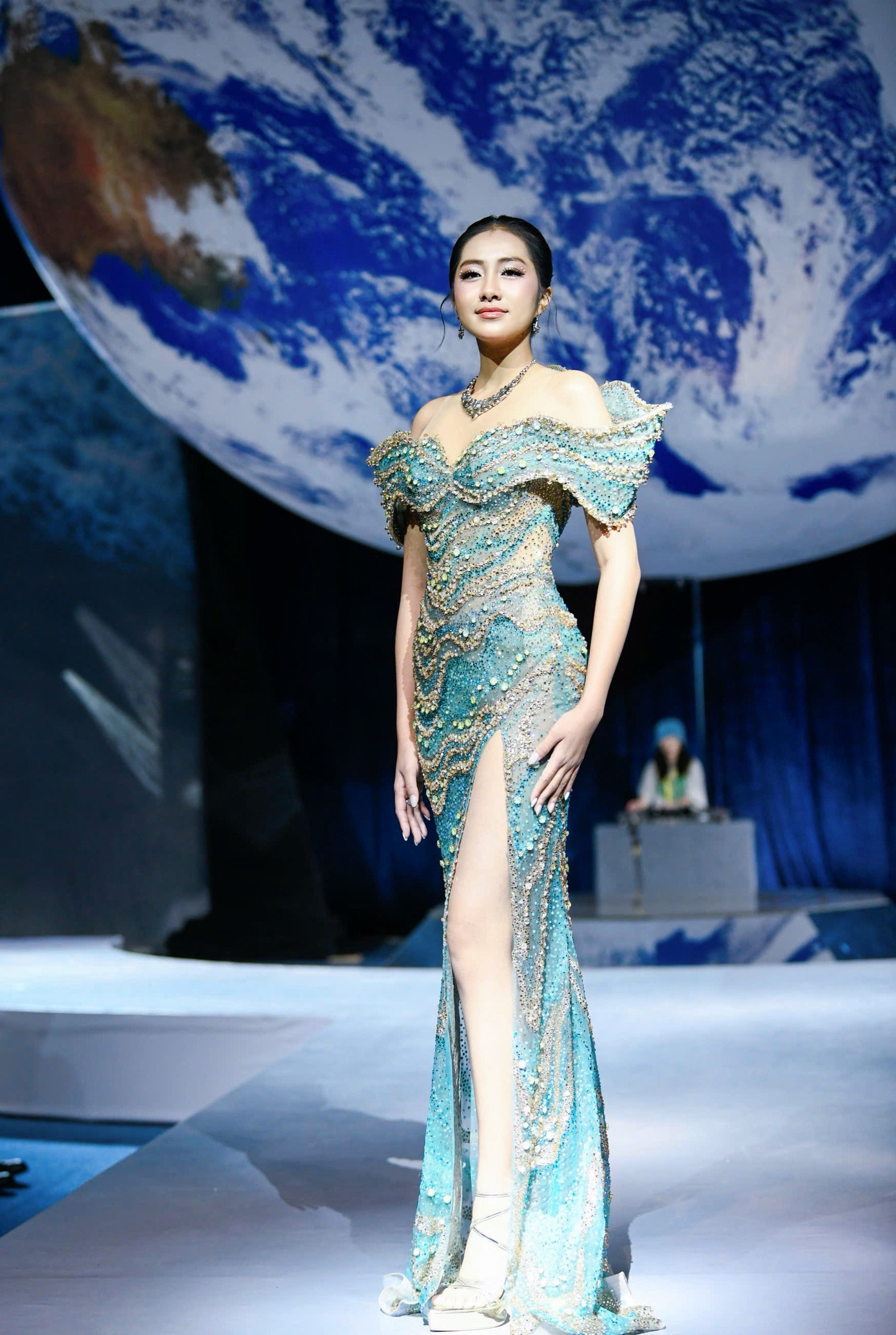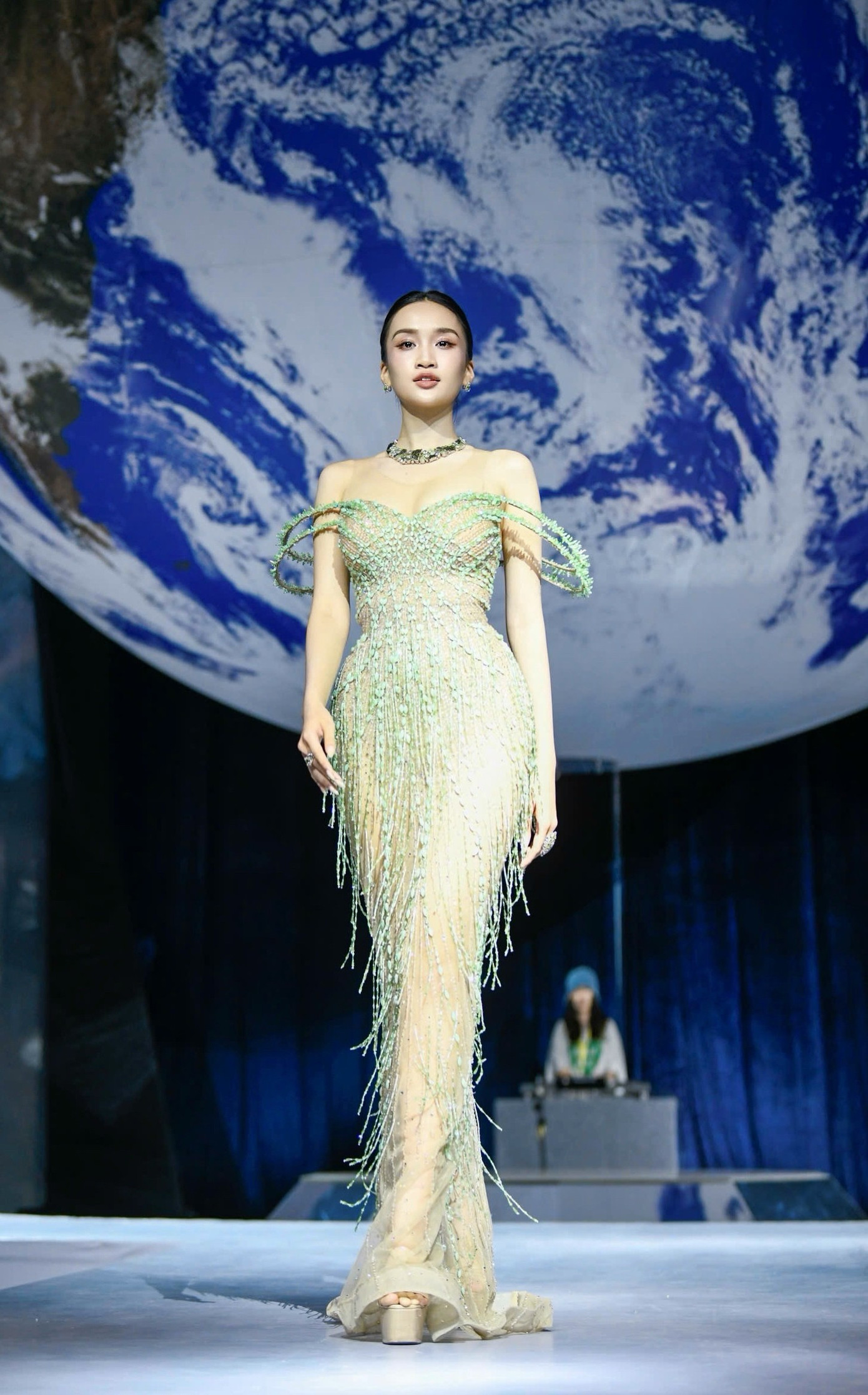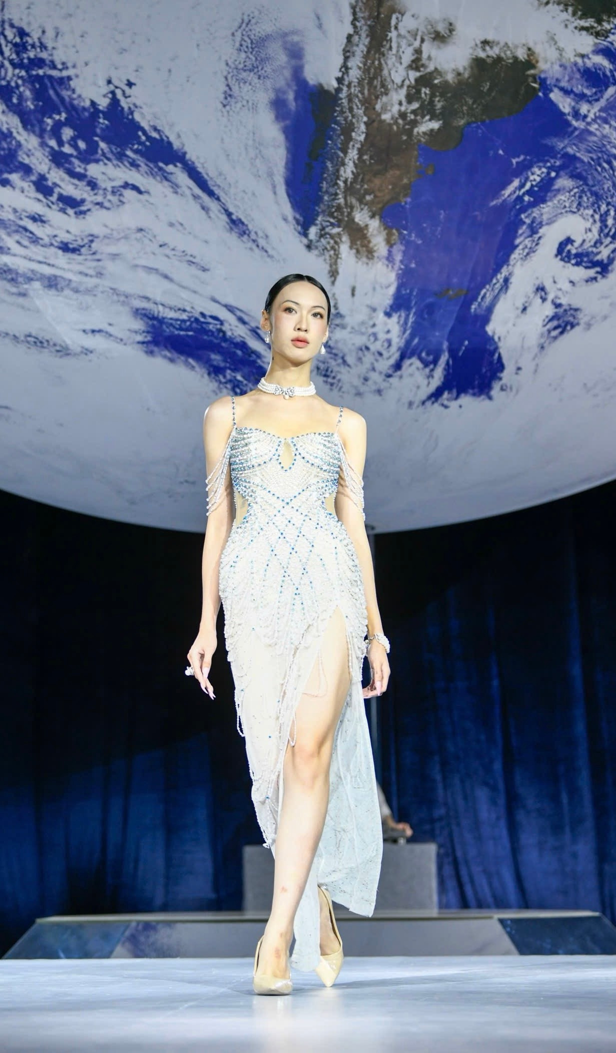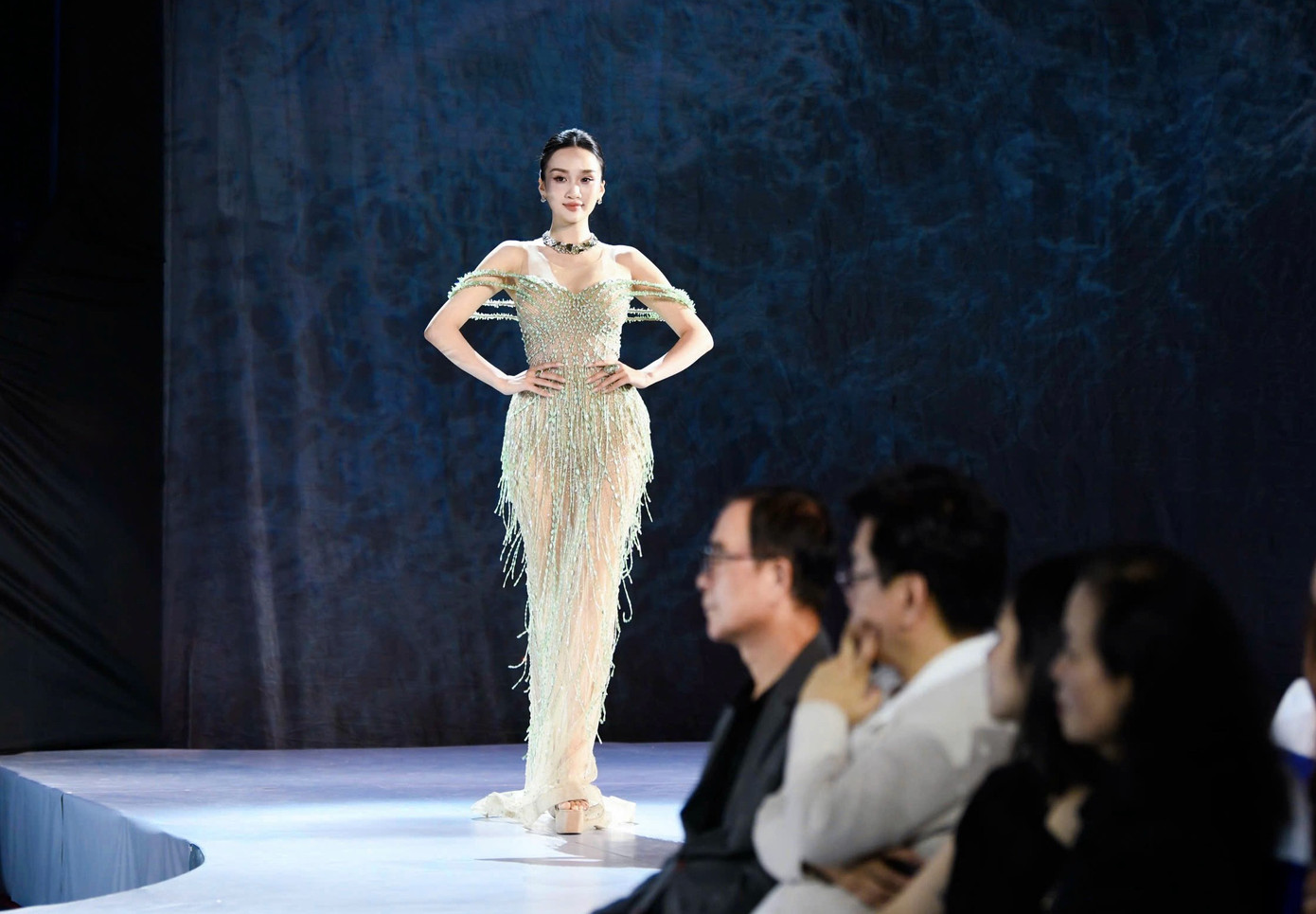 Hoa hậu Hà Trúc Linh là vedette của show diễn. Cô trình diễn thiết kế váy dạ hội đính đá uyển chuyển. Thiết kế giúp Trúc Linh khoe vai trần. Sau gần 4 tháng đăng quang, Hoa hậu Việt Nam 2024 được nhận xét ngày càng ấn tượng về thần thái sắc vóc.