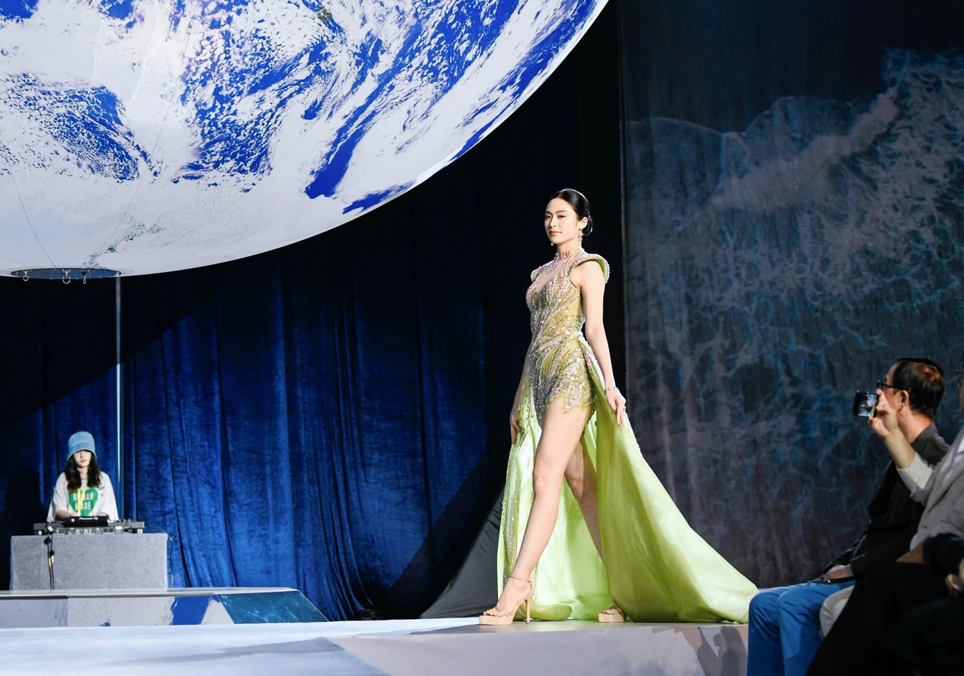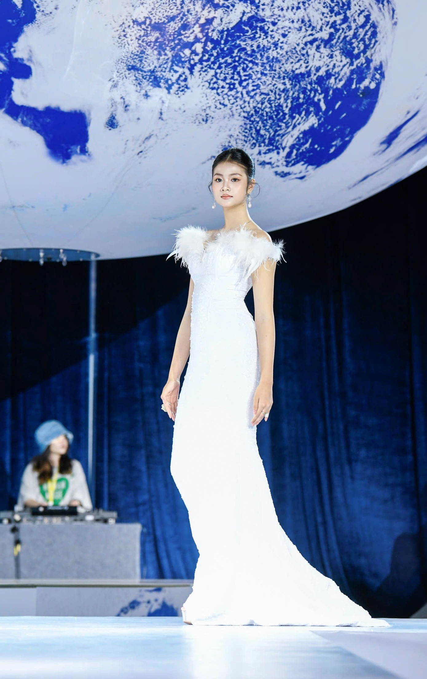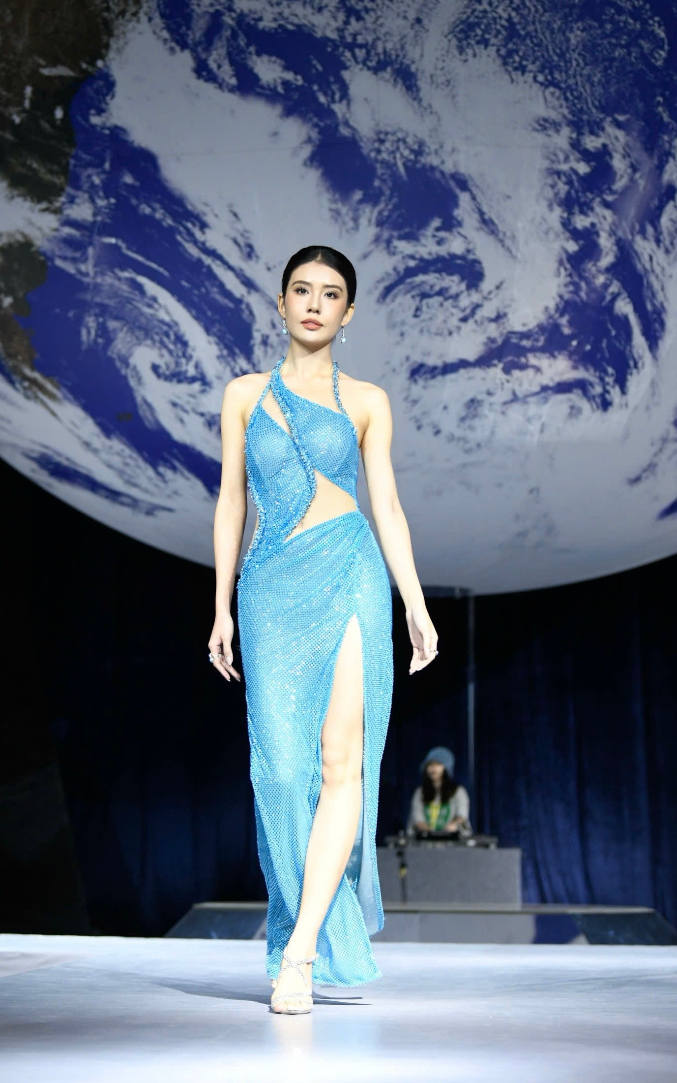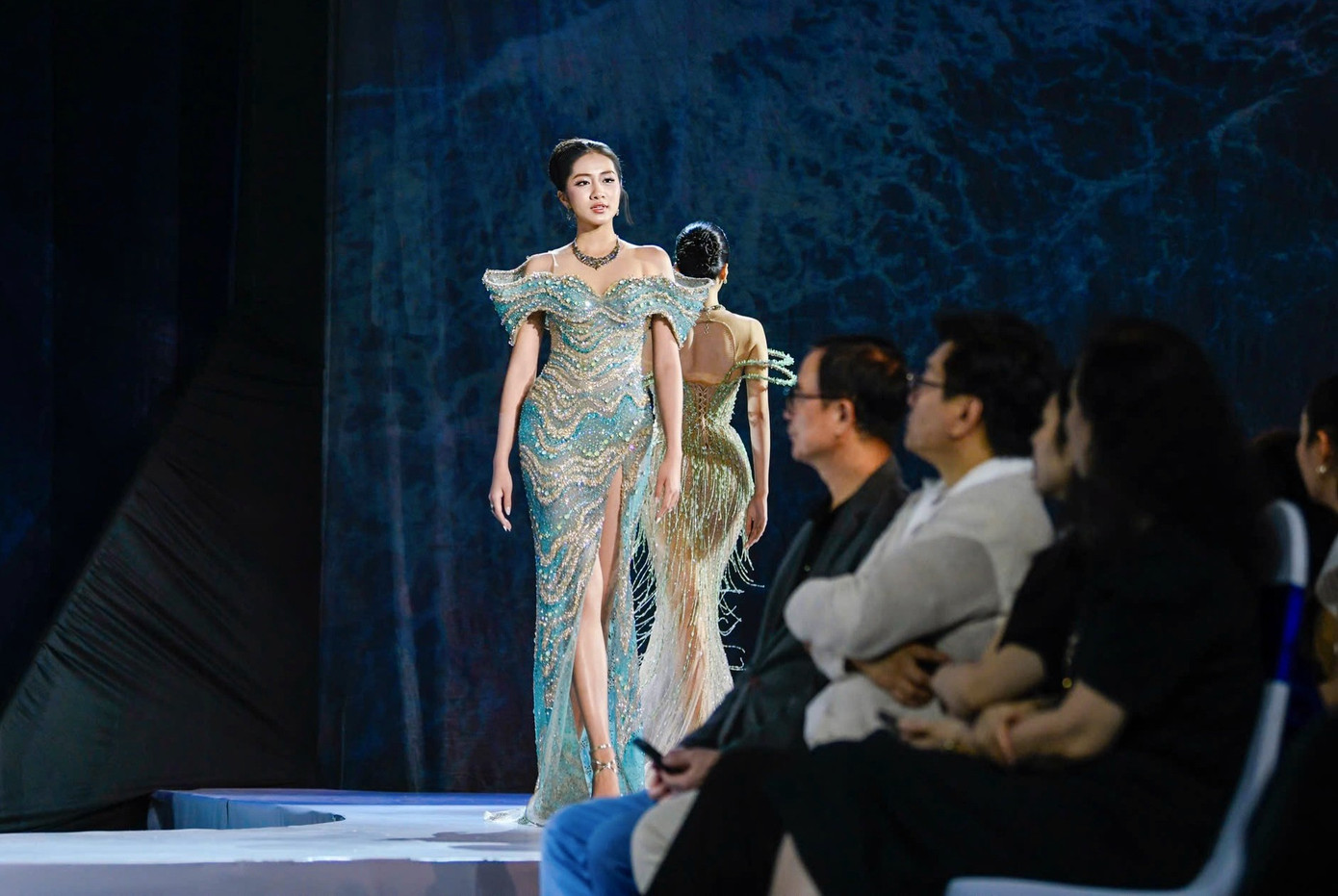 Hoa hậu Hà Trúc Linh là vedette của show diễn. Cô trình diễn thiết kế váy dạ hội đính đá uyển chuyển. Thiết kế giúp Trúc Linh khoe vai trần. Sau gần 4 tháng đăng quang, Hoa hậu Việt Nam 2024 được nhận xét ngày càng ấn tượng về thần thái sắc vóc.