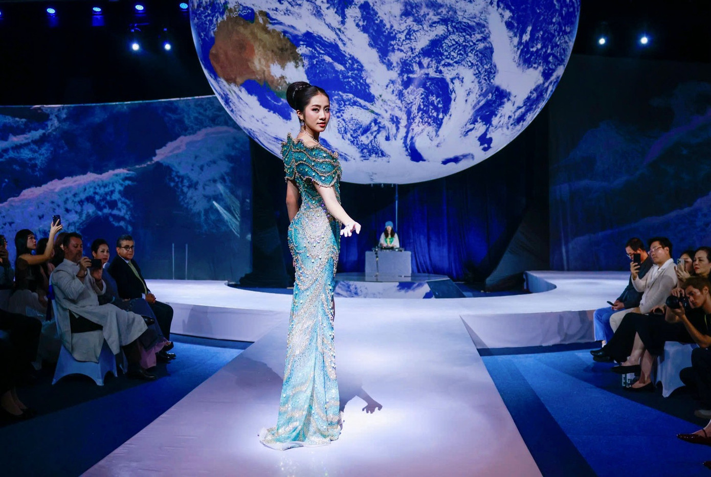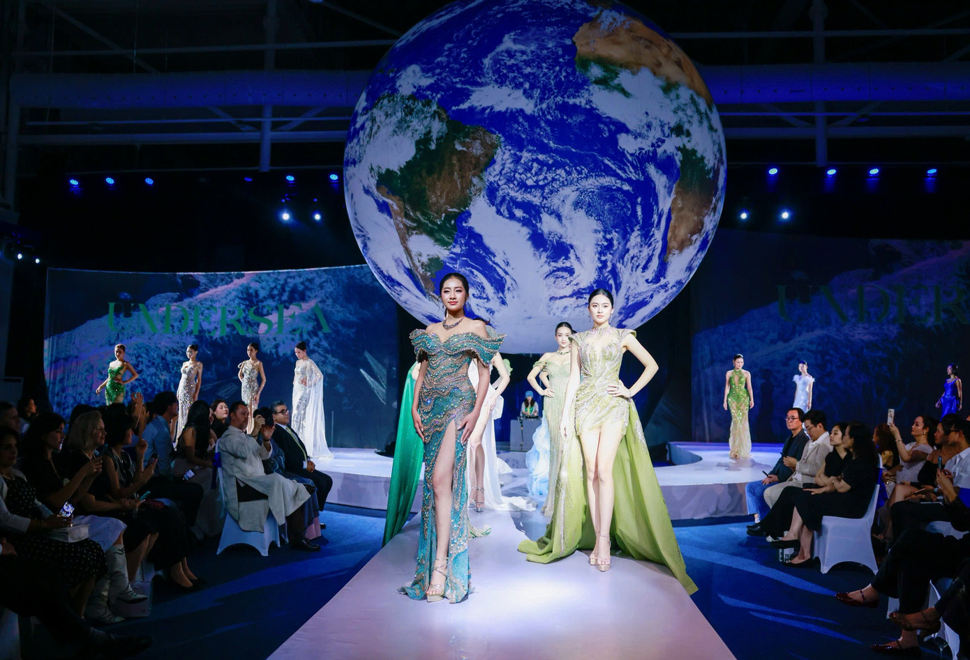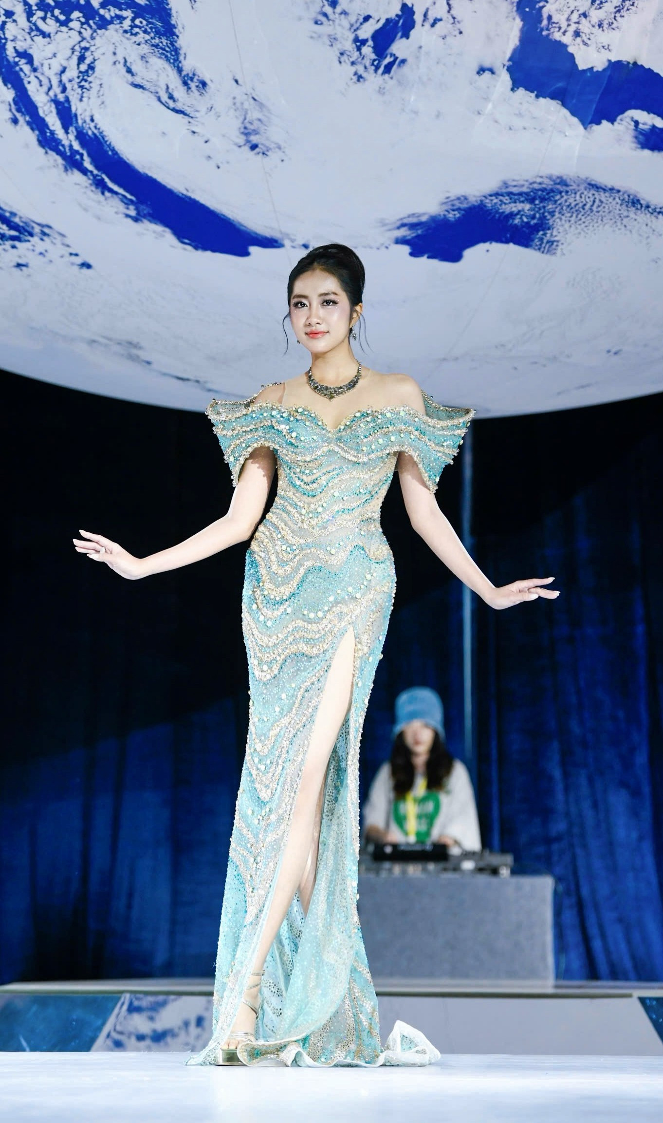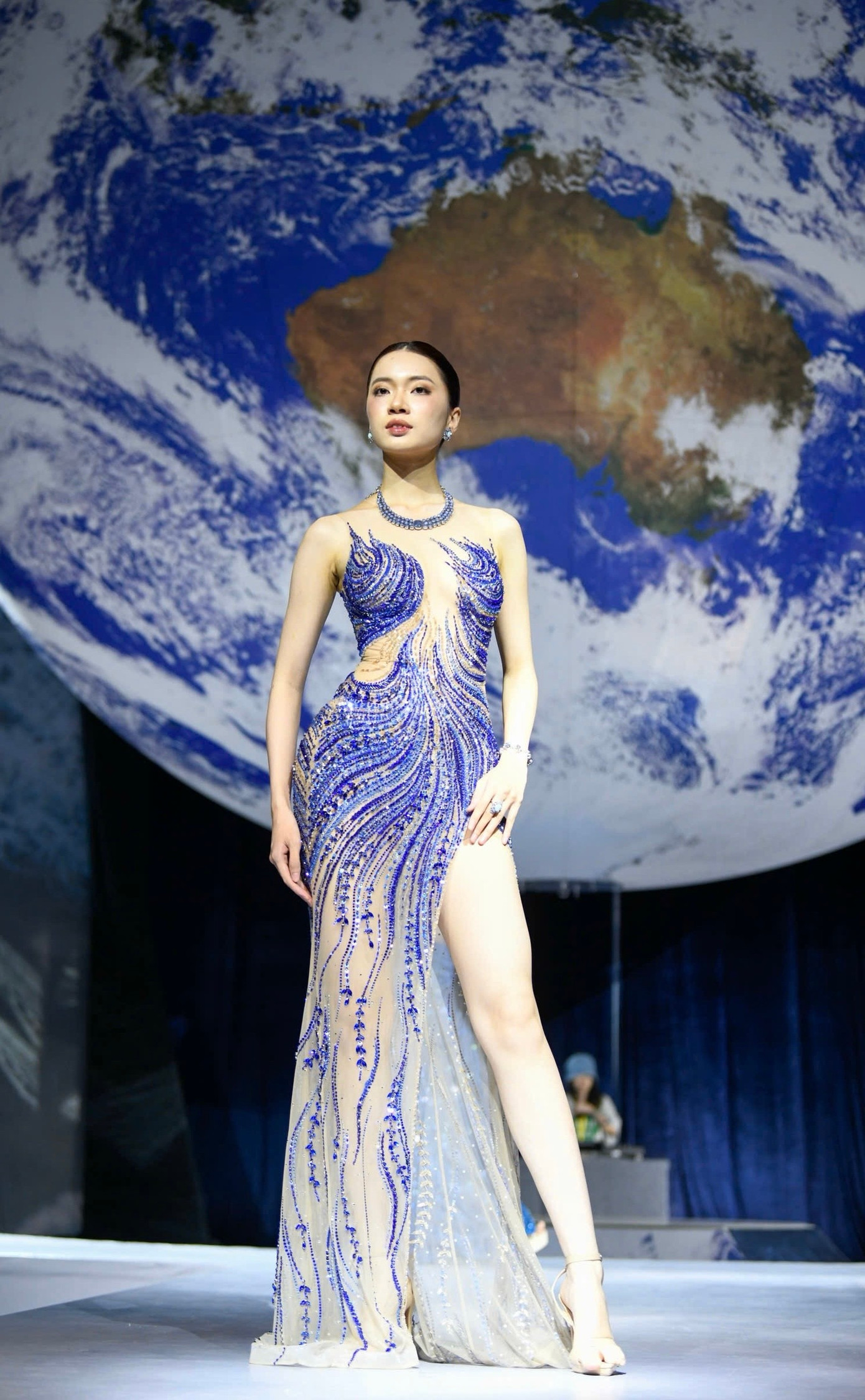 Hoa hậu Hà Trúc Linh là vedette của show diễn. Cô trình diễn thiết kế váy dạ hội đính đá uyển chuyển. Thiết kế giúp Trúc Linh khoe vai trần. Sau gần 4 tháng đăng quang, Hoa hậu Việt Nam 2024 được nhận xét ngày càng ấn tượng về thần thái sắc vóc.