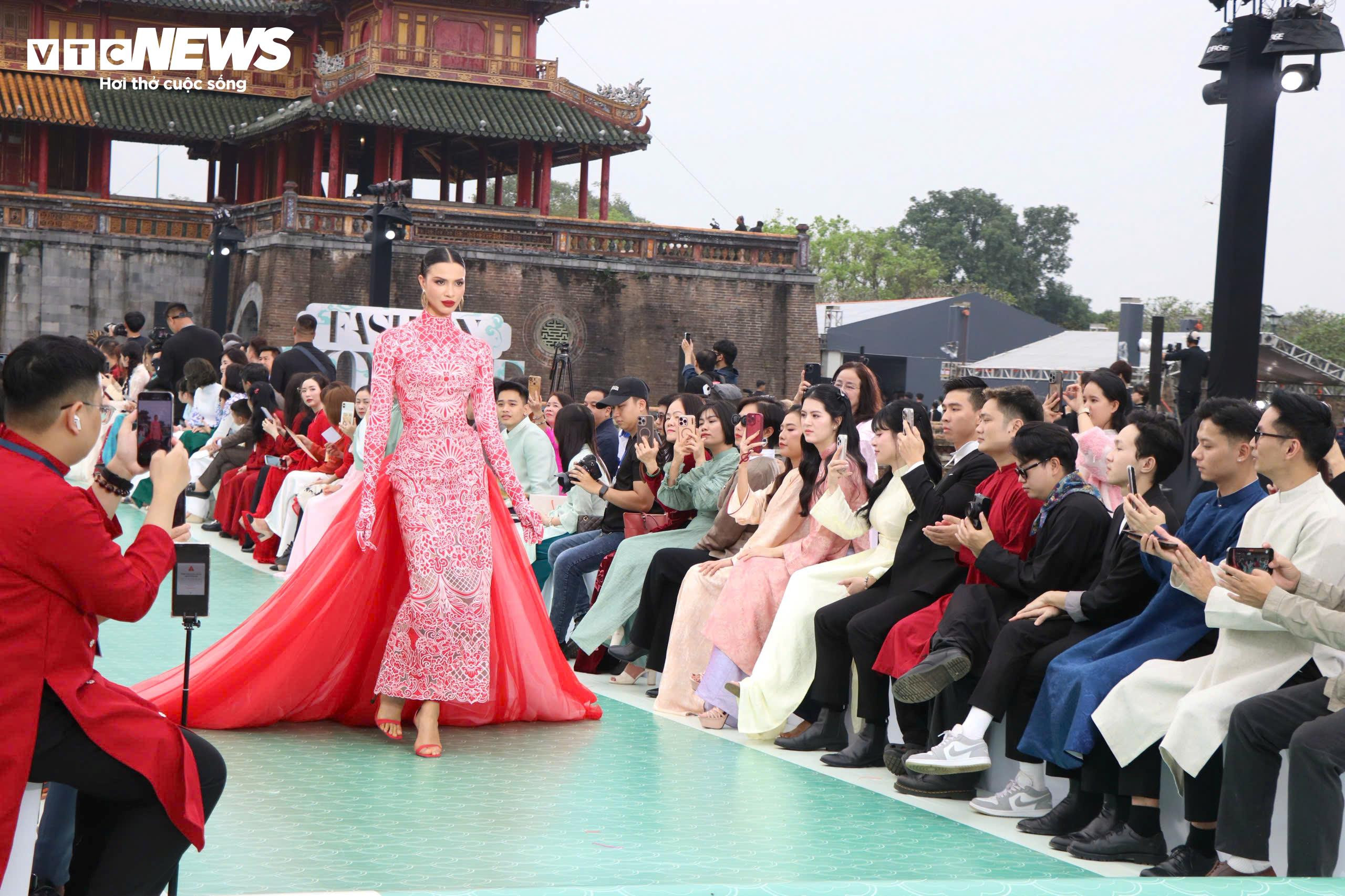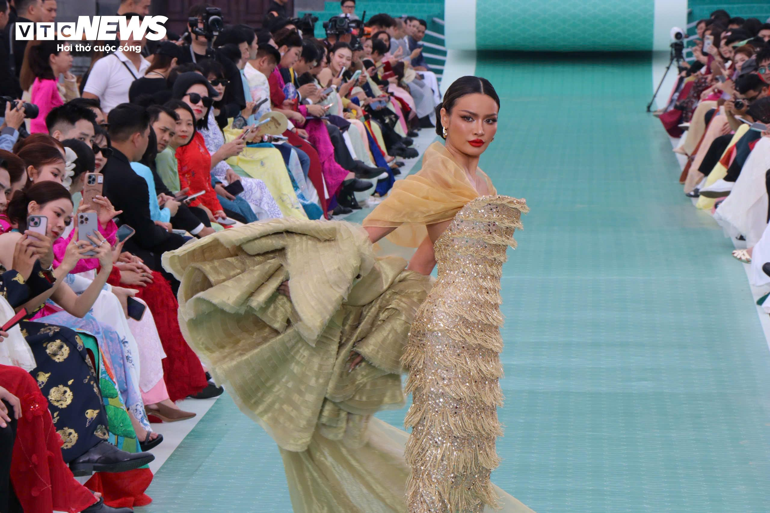 Gần 80 thí sinh Miss Cosmo 2025 trình diễn đầy ấn tượng và tinh tế, biến thời trang thành lăng kính đưa vẻ đẹp văn hóa Việt Nam vươn ra thế giới. Là những người đẹp đầu tiên khoác lên mình bộ sưu tập, Hoa hậu Hoàn vũ 2024 Ketut Permata Juliastrid, Á hậu Hoàn vũ 2024 Mook Karnruethai Tassabut và Hoa hậu Hoàn vũ Việt Nam 2025 Nguyễn Hoàng Phương Linh xuất hiện với vẻ đẹp hài hòa giữa truyền thống và hiện đại, nổi bật qua bảng màu đặc trưng và họa tiết mang dấu ấn Huế.