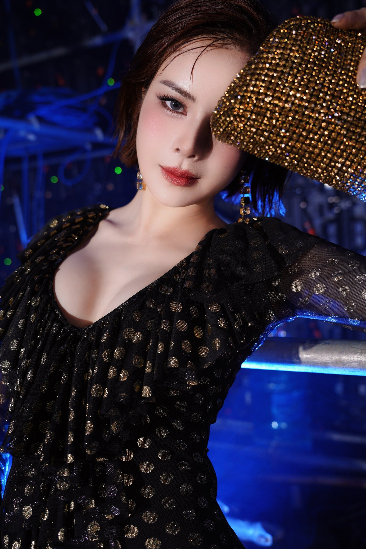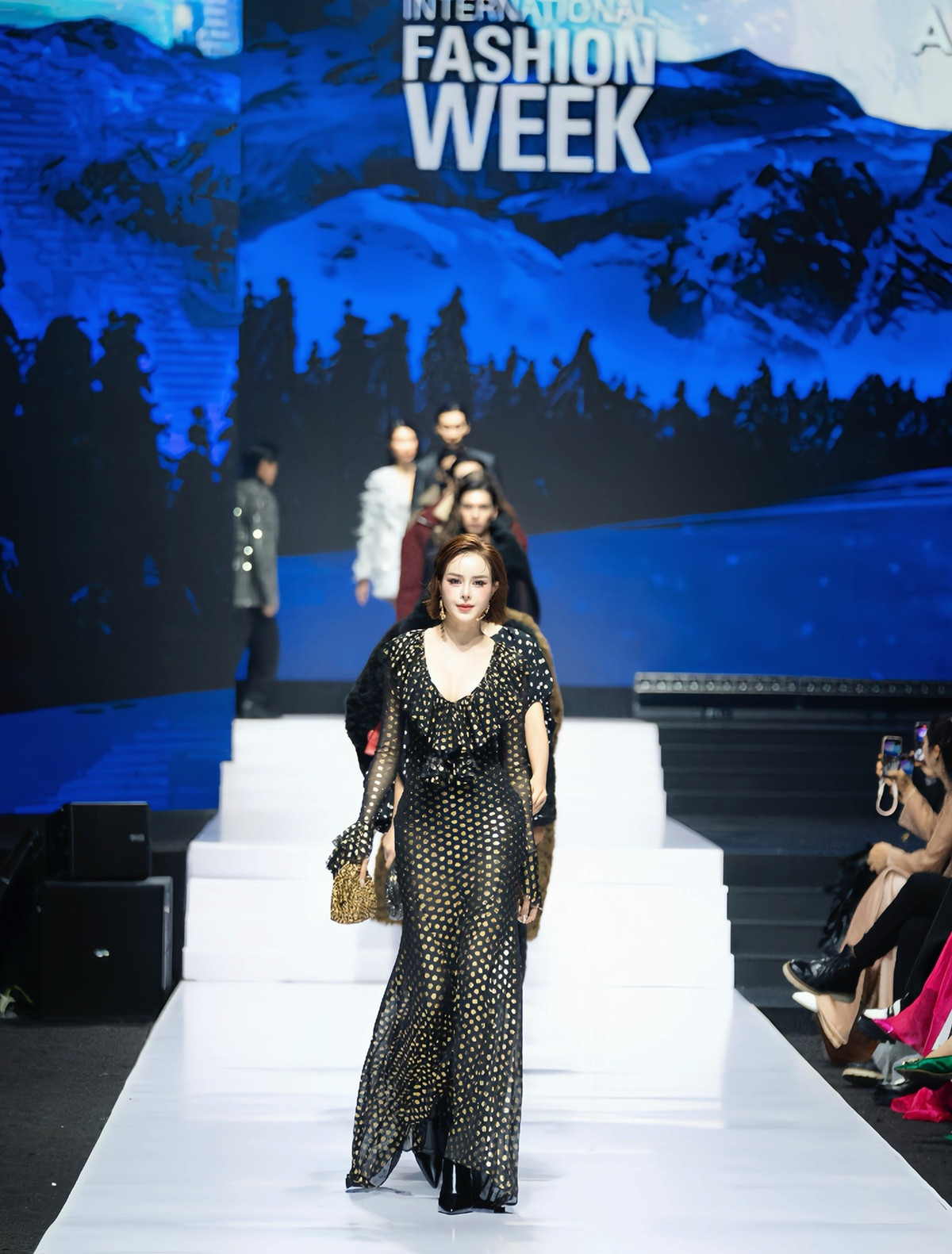 Trình diễn trong thiết kế váy đuôi cá dài màu đen chấm bi vàng đặc trưng của bộ sưu tập, Sella Trương giữ phong độ vững vàng với lối catwalk tiết chế nhưng sắc nét và vô cùng lôi cuốn.