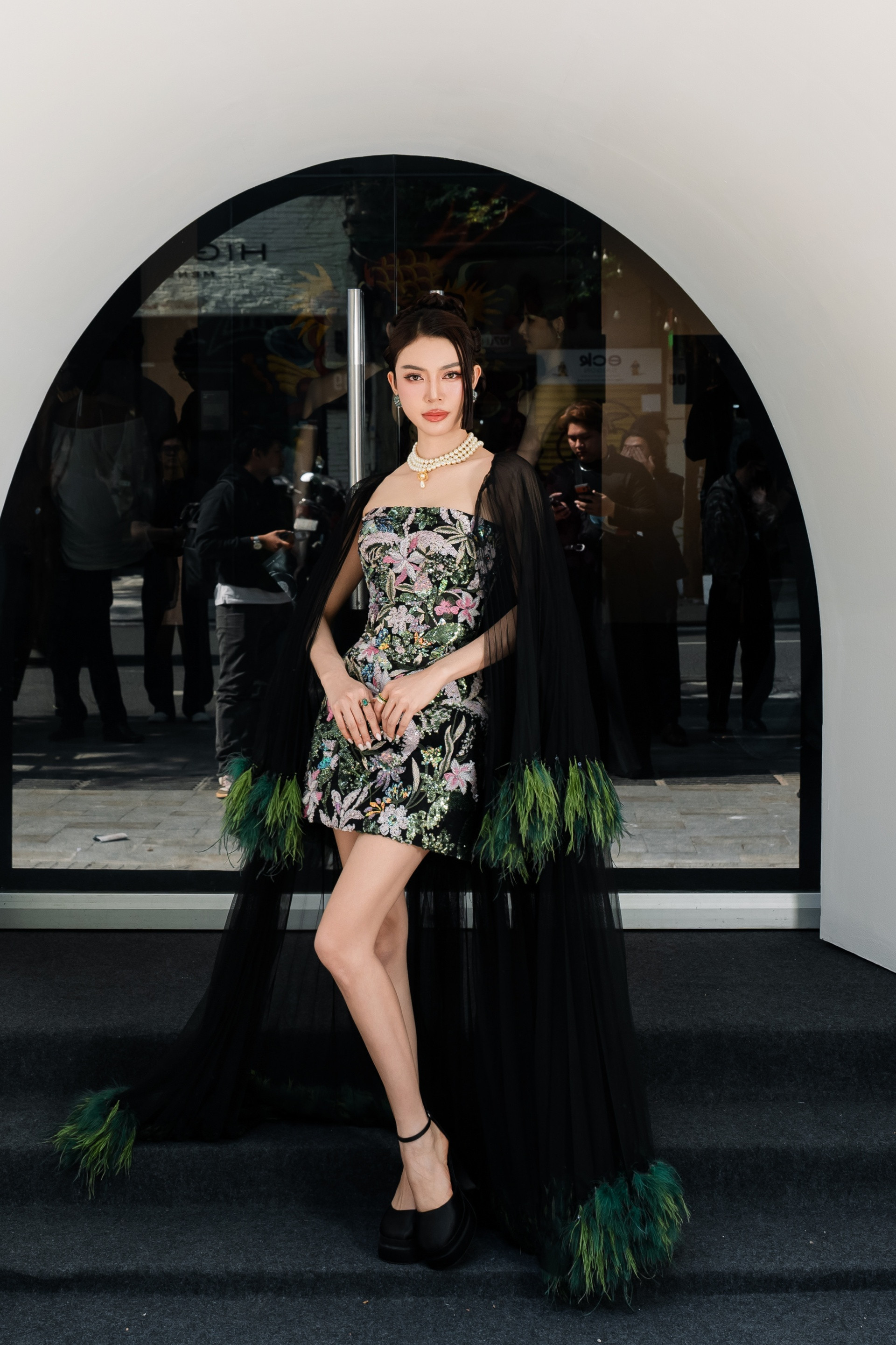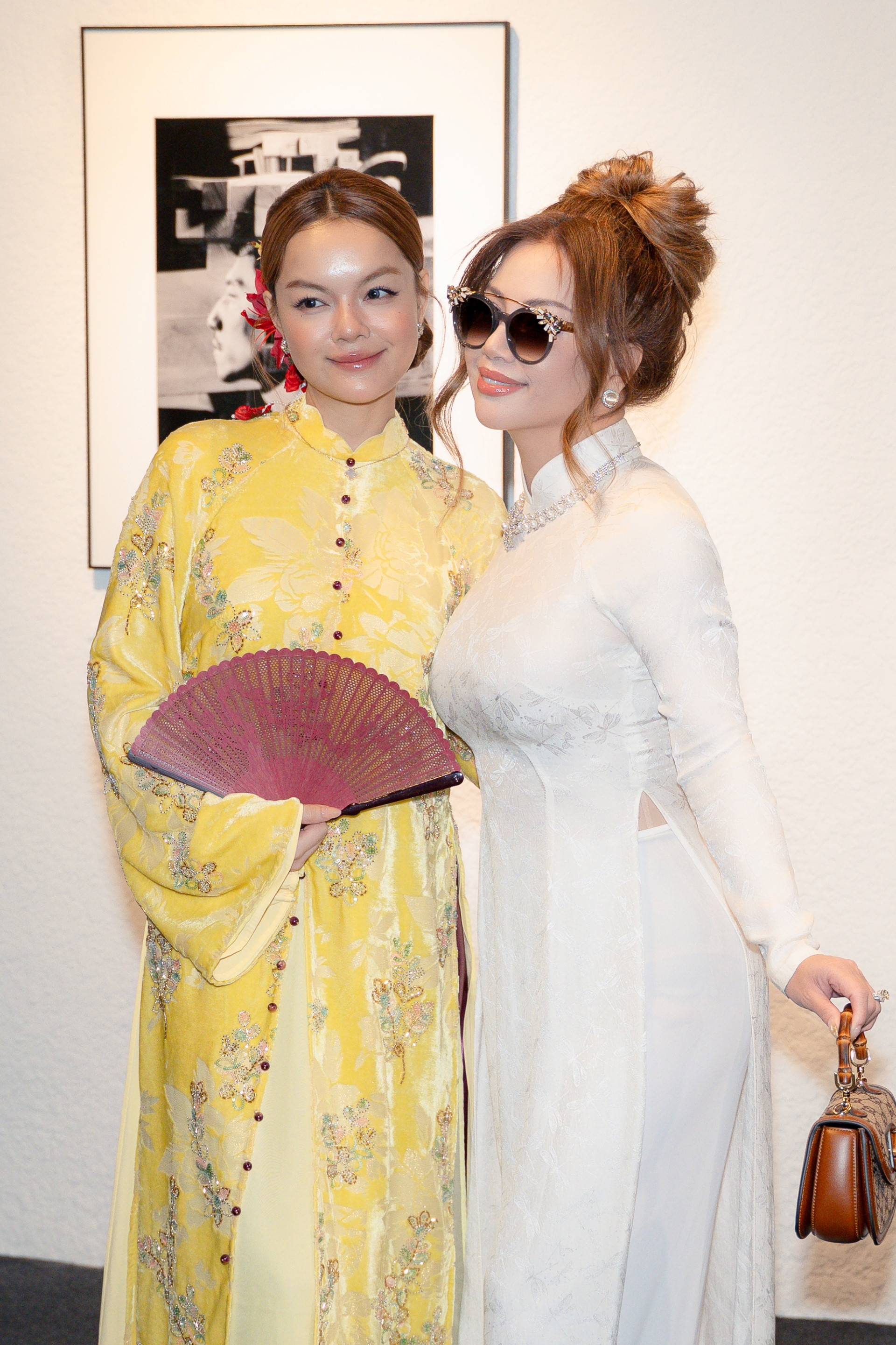 Dàn người đẹp chọn trang phục kết hợp phong cách truyền thống, hiện đại để tham dự triển lãm.