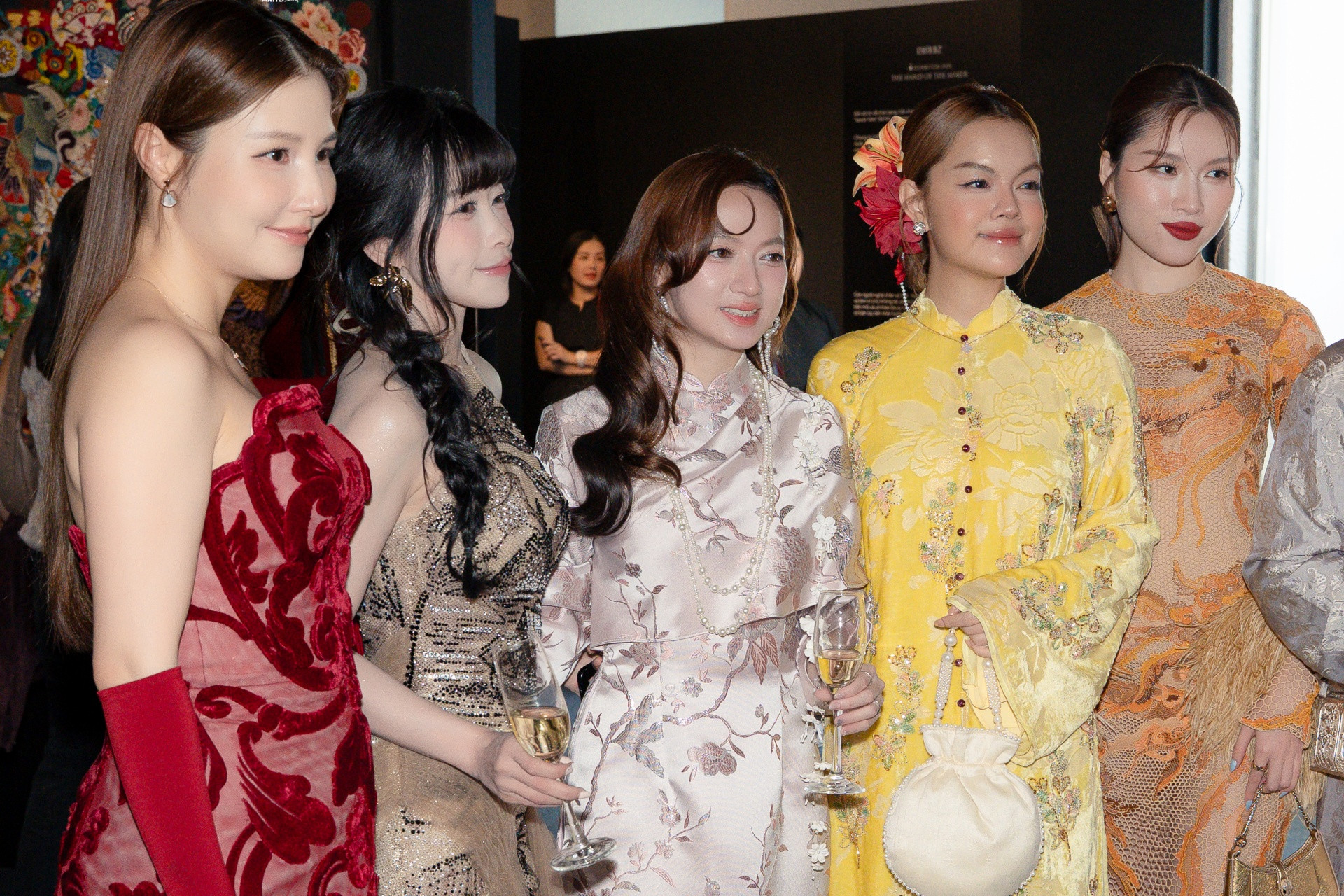 "Chị đẹp" Minh Tuyết, Phạm Quỳnh Anh, Xuân Nghi, Jun Phạm, Lan Khuê xuất hiện trong trang phục áo dài. Hoa hậu Thanh Thủy diện váy dạ hội cổ yếm cách tân. Châu Tuyết Vân cũng chọn váy yếm và nón quai thao cách tân. Á hậu Quỳnh Anh nổi bật với trang phục tông đỏ mang hoa văn độc đáo.