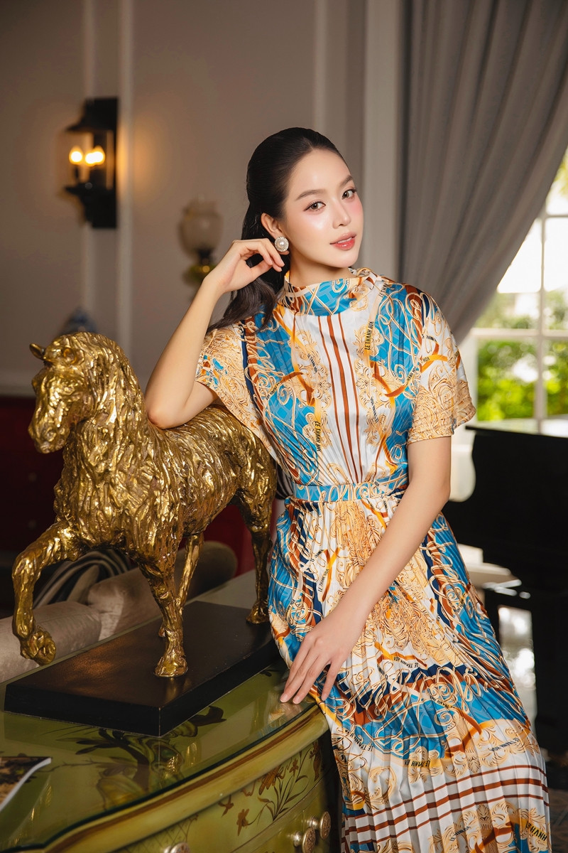 Họa tiết hoàng gia trên nền chất liệu lụa mềm mại với tông màu xanh, vàng và cam phối hợp hài hòa. Thanh Thủy tự tin khoe dáng với thiết kế có tay phồng ngắn, tạo silhouette nữ tính và duyên dáng.