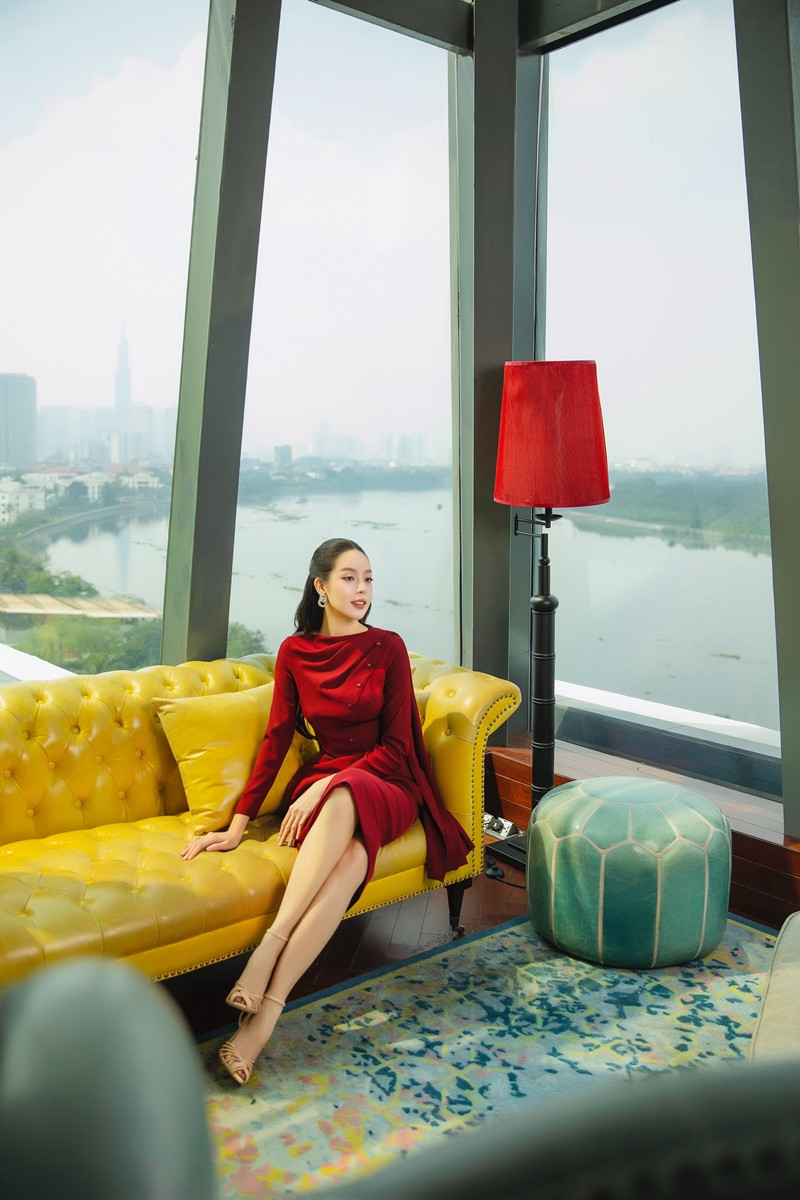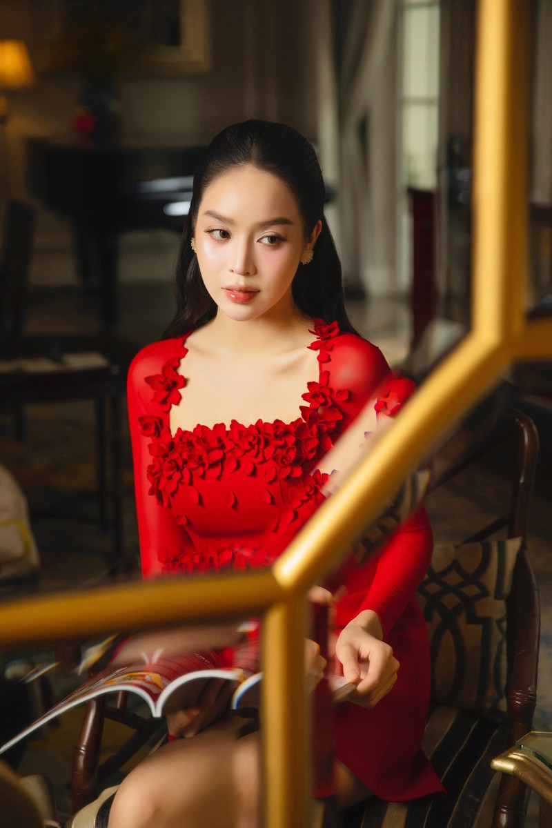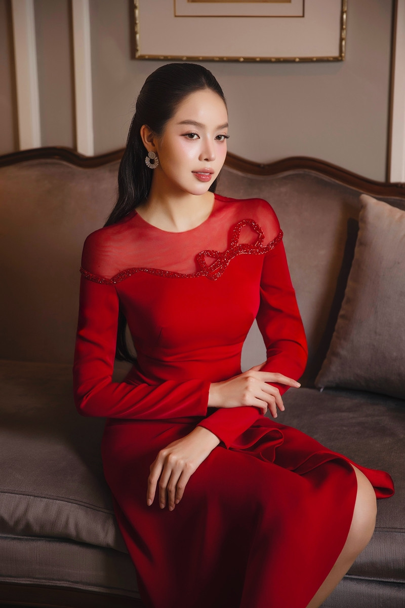 Chuyển sang phong cách trưởng thành và quyến rũ hơn, Thanh Thủy diện bộ váy đỏ burgundy ôm sát với thiết kế cut-out tinh tế ở eo. Đường cắt may tỉ mỉ tôn lên đường cong cơ thể, trong khi chất liệu vải mềm mại tạo cảm giác thoải mái. Sắc đỏ thẫm sang trọng phù hợp với không khí Tết truyền thống.
