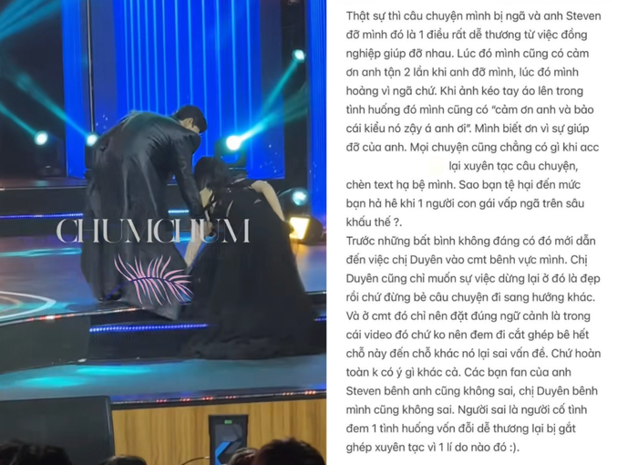 Khi Steven Nguyễn giúp cô chỉnh lại dây váy, Thiên Ân cũng đã khéo léo giải thích ngắn gọn để đồng nghiệp yên tâm. Tuy nhiên, vấn đề trở nên phức tạp khi xuất hiện các video cố tình cắt ghép, biến một tình huống tích cực thành căng thẳng nhằm thu hút sự chú ý của dư luận.