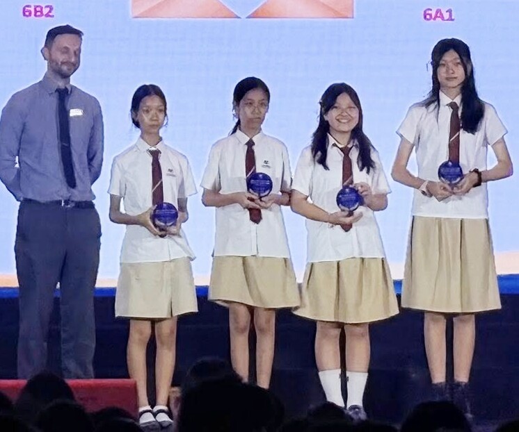Tiểu Panda đứng cao gần bằng thầy giáo người nước ngoài khi lên nhận giải thưởng.