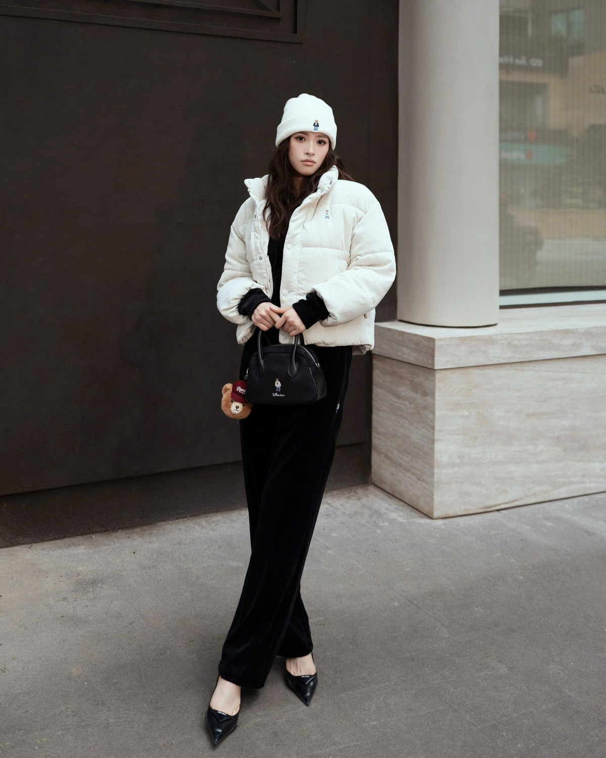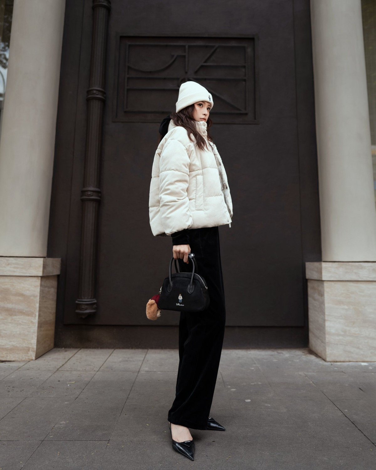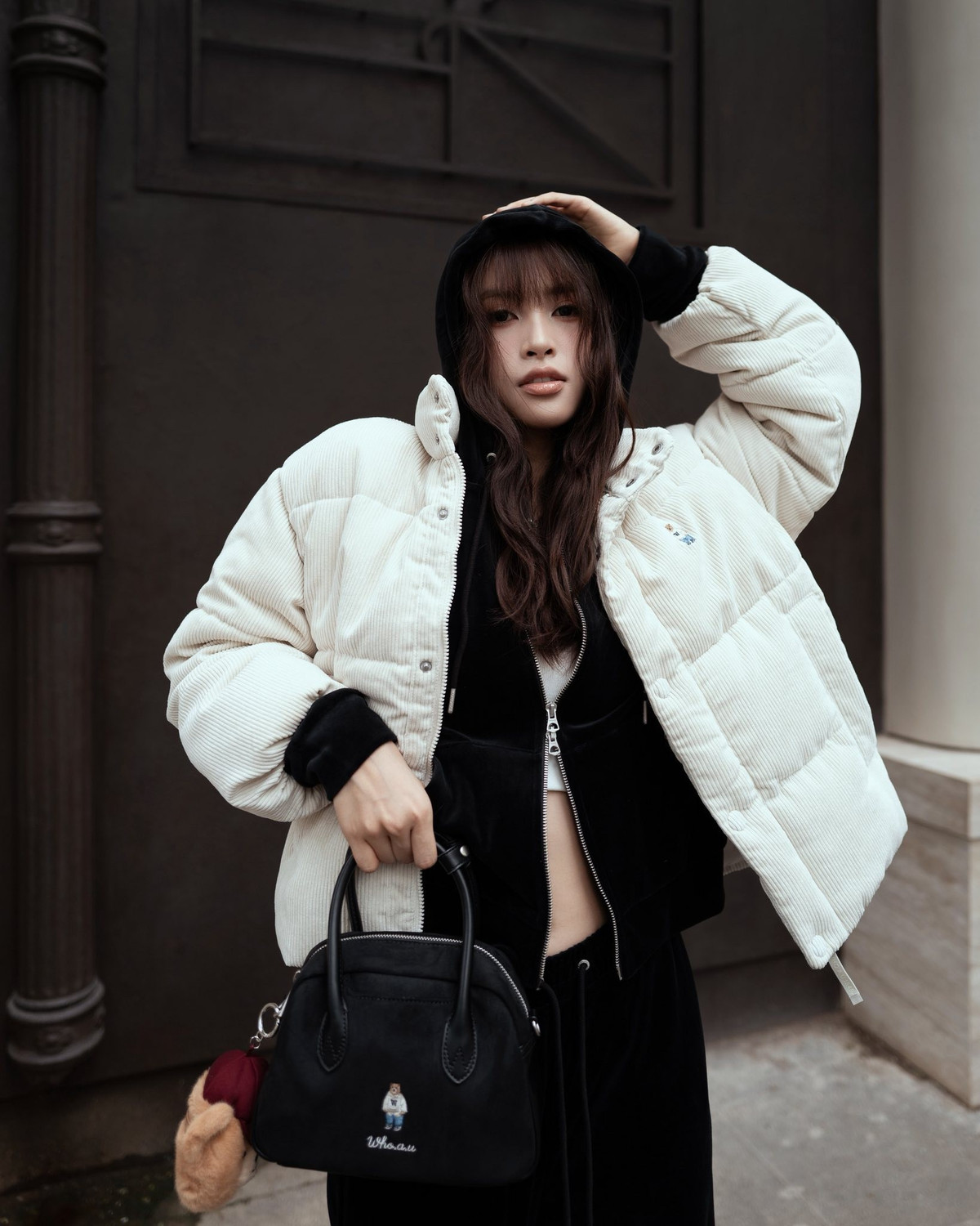 Set đồ đơn giản chỉ 2 màu đen trắng nhưng cách mix match tinh tế với mũ len, túi xách cùng tông màu và thần thái khiến bộ đồ của Tiểu Vy trở nên thời thượng.