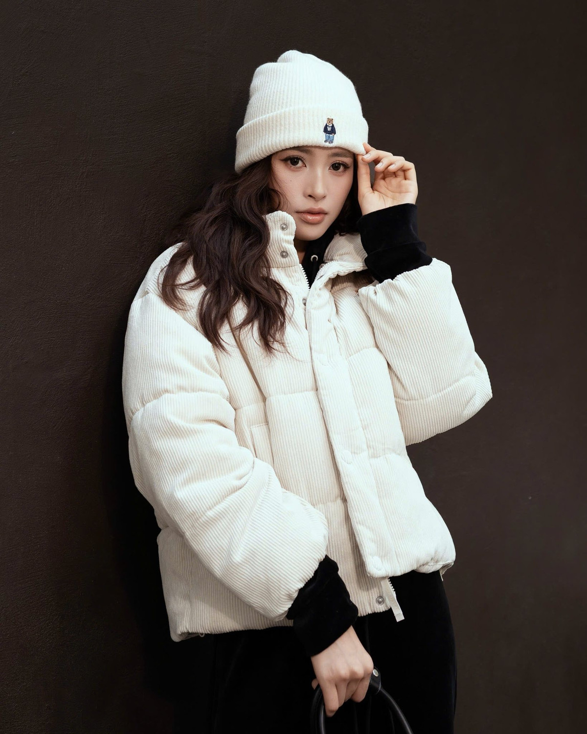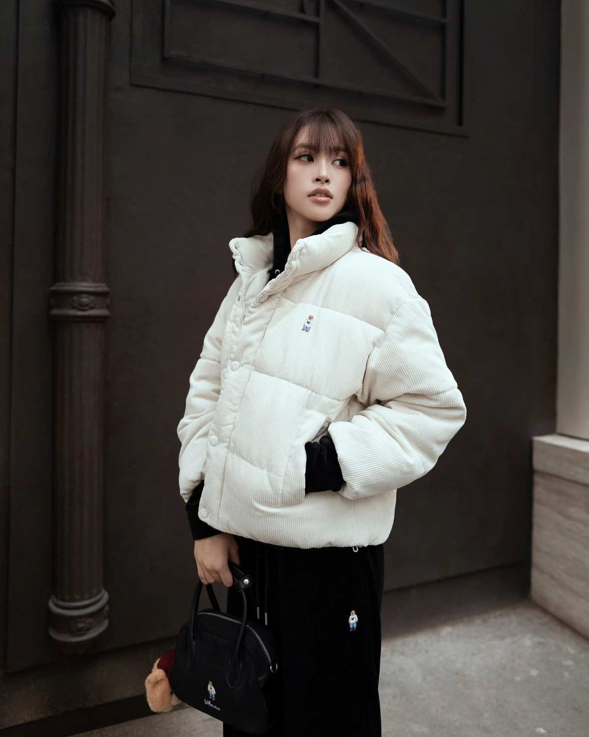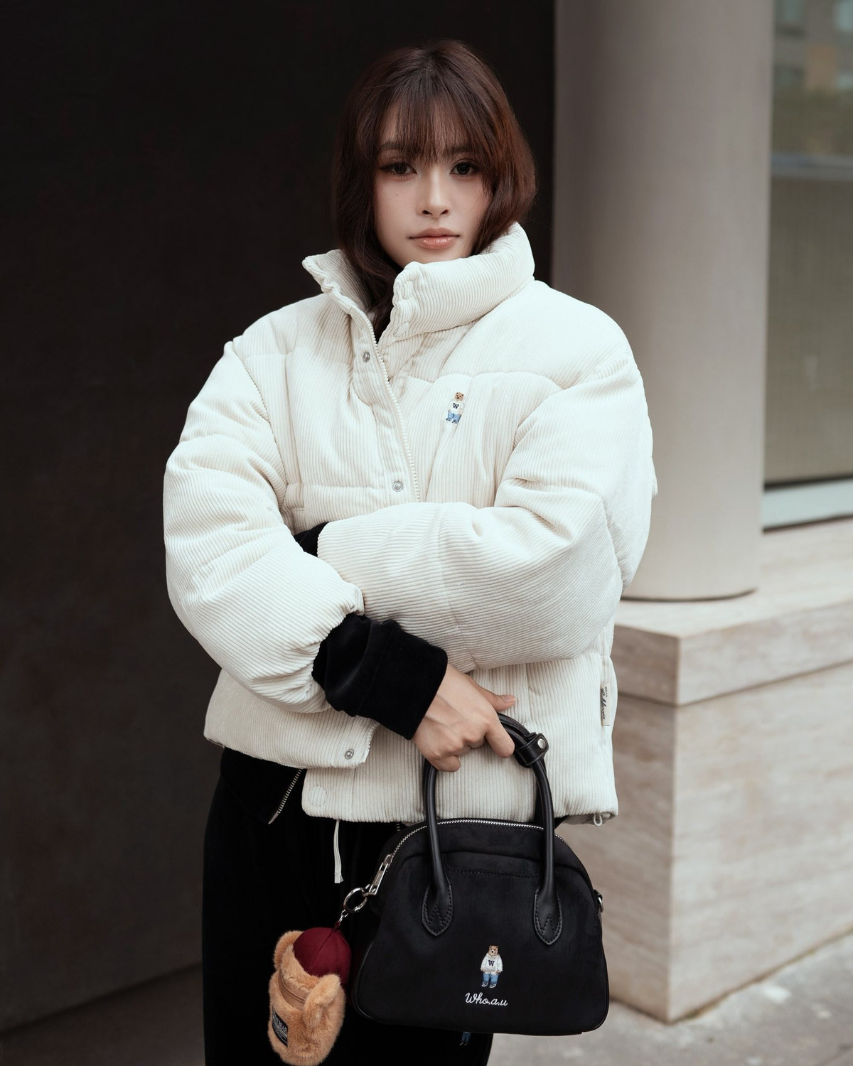 Set đồ đơn giản chỉ 2 màu đen trắng nhưng cách mix match tinh tế với mũ len, túi xách cùng tông màu và thần thái khiến bộ đồ của Tiểu Vy trở nên thời thượng.