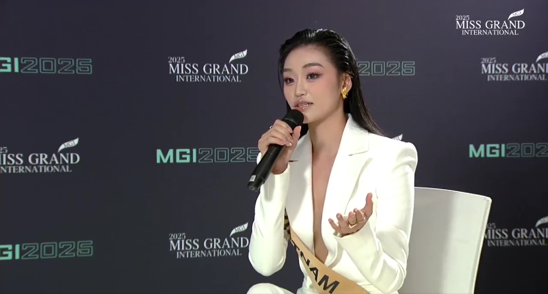 Chiều 10/10, Yến Nhi bước vào phần thi Phỏng vấn kín cùng Chủ tịch Nawat Itsaragrisil, Phó Chủ tịch Teresa Chaivisut và đương kim hoa hậu Christine Juliane Opiaza ở Miss Grand International (Hoa hậu Hòa bình Quốc tế) 2025.
