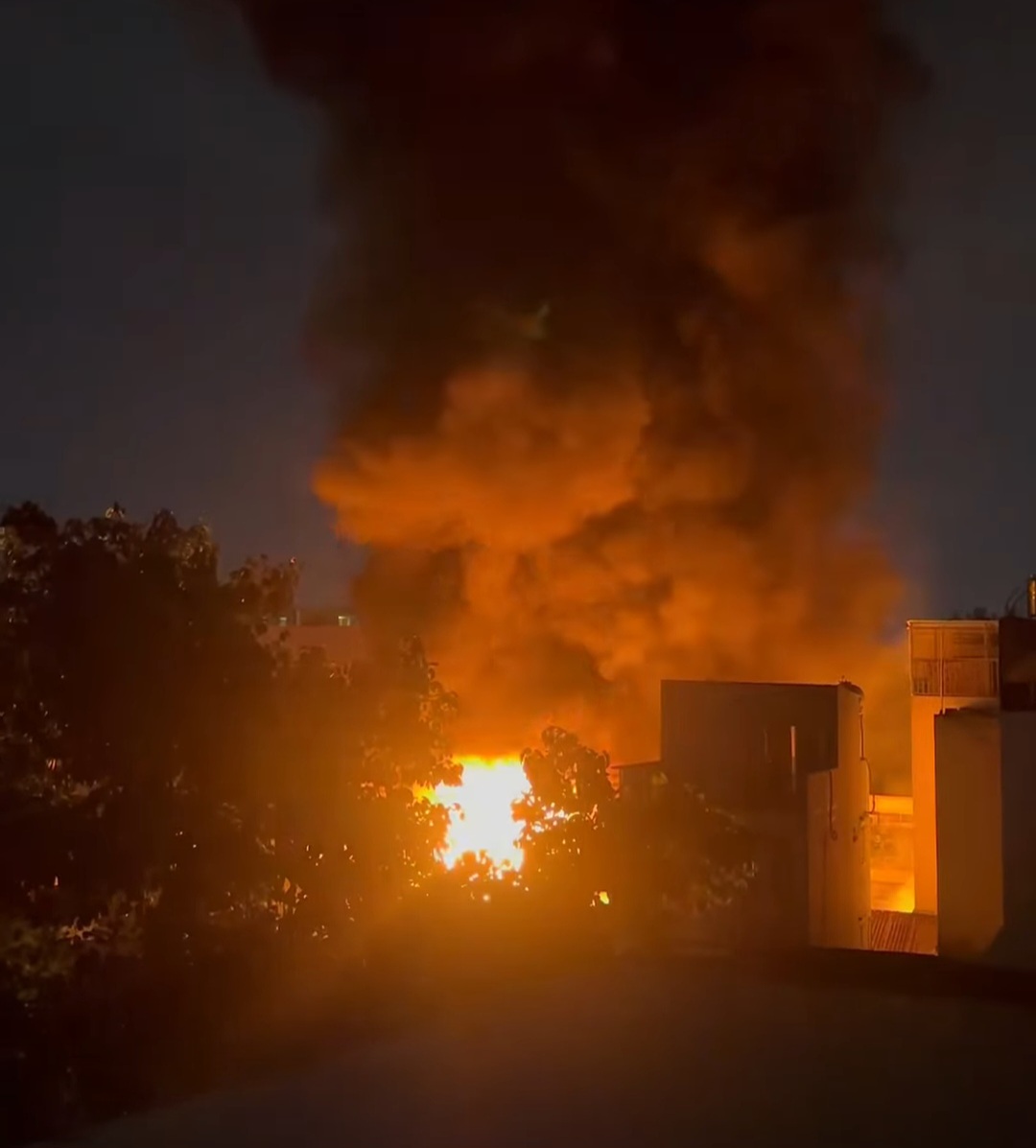 Khoảng 18 giờ cùng ngày, ngọn lửa cùng khói đen cuồn cuộn bắt đầu bốc lên từ kho phế liệu đóng kín cửa trên đường số 5, cách ngã tư Bốn Xã khoảng 1km.