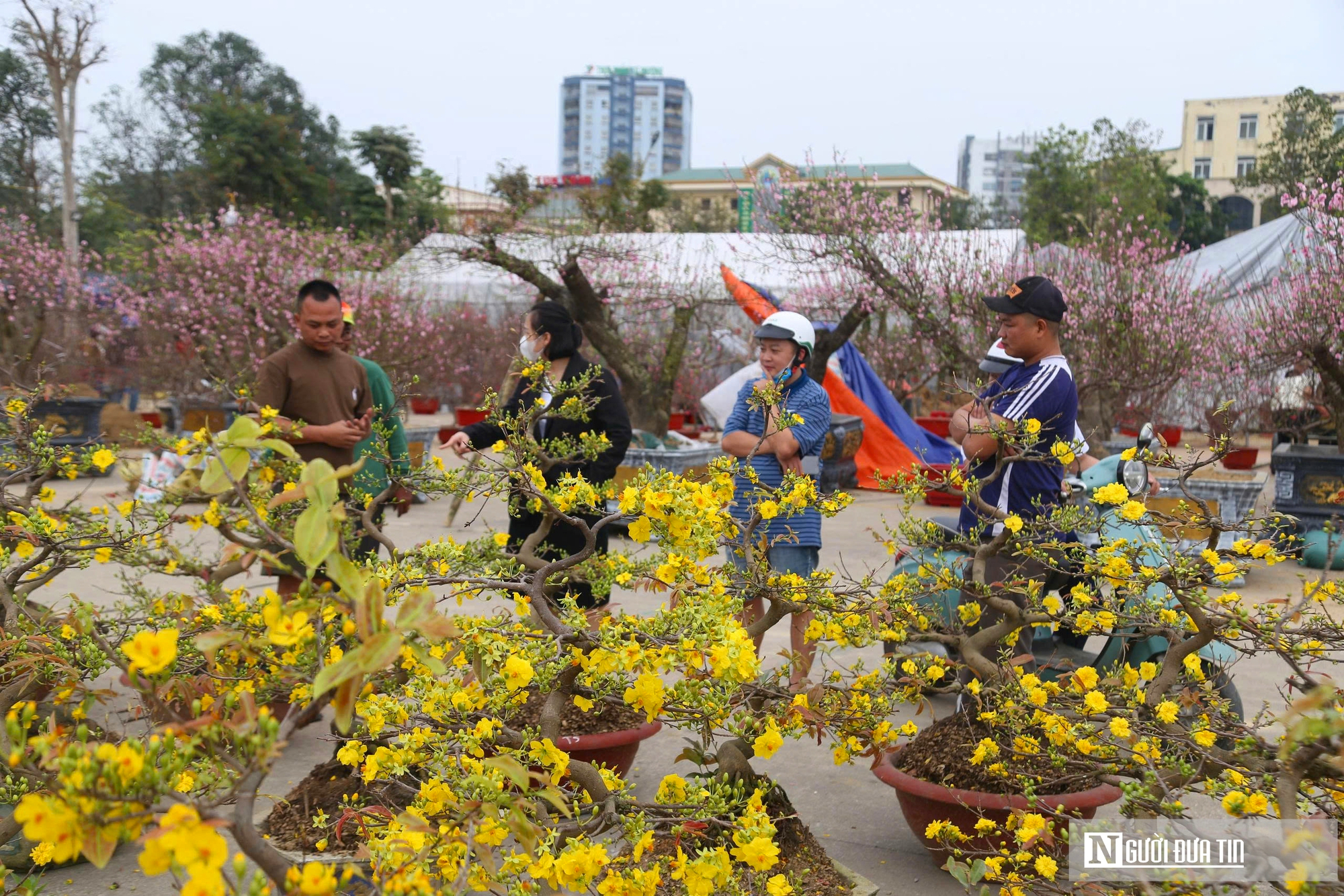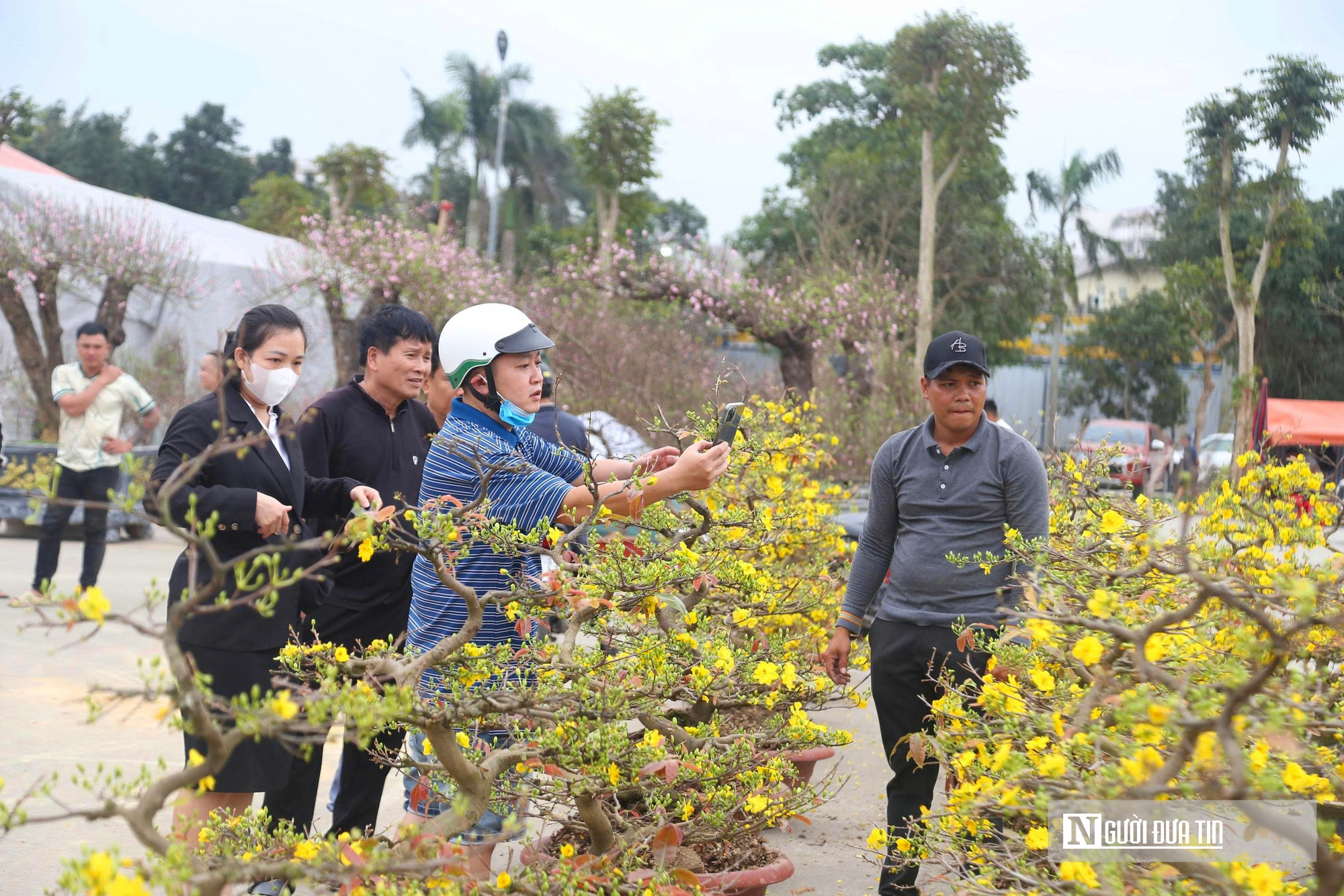 Mặc dù, những chậu mai "xuống phố" muộn hơn các loài hoa khác nhưng cũng thu hút rất đông người dân lựa chọn về chơi Tết.
