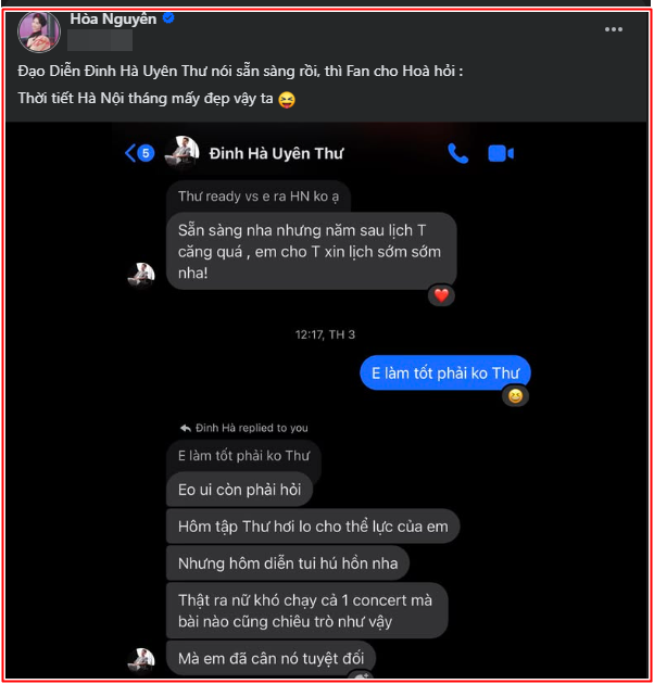 Sau thành công của fan concert Bắc Bling diễn ra tại TP.HCM vào đầu tháng 2, Hòa Minzy tiếp tục trở thành tâm điểm chú ý khi hé lộ những kế hoạch tiếp theo cho chuỗi concert dành riêng cho người hâm mộ. Trên trang cá nhân, nữ ca sĩ đã công khai đoạn tin nhắn trao đổi với đạo diễn Đinh Hà Uyên Thư - người đứng sau thành công của Bắc Bling Day 1, qua đó xác nhận cả hai sẽ tiếp tục đồng hành trong Day 2 của fan concert, dự kiến tổ chức tại Hà Nội. Tuy nhiên, thời điểm cụ thể của đêm diễn này hiện vẫn chưa được chốt.