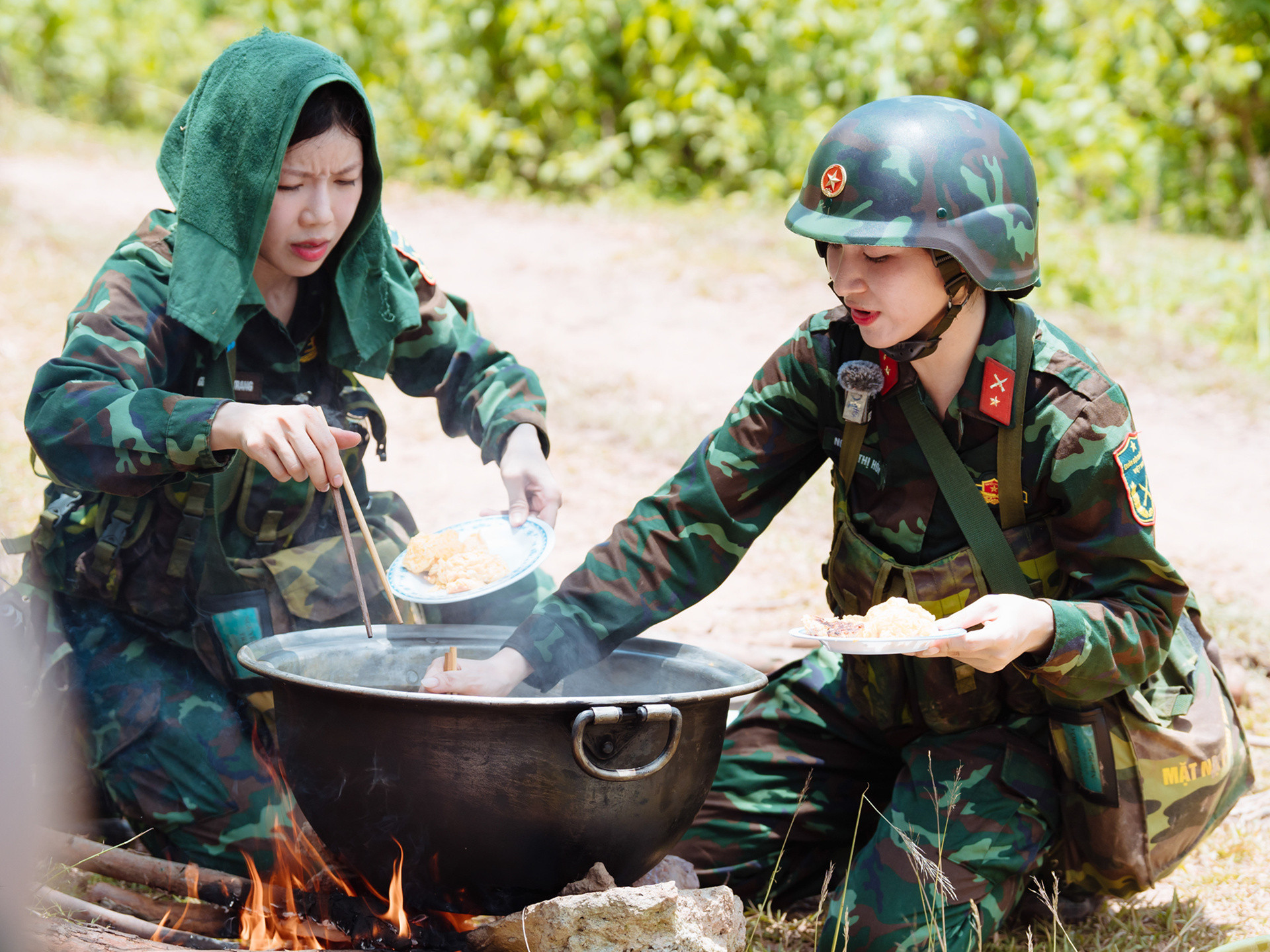 Sau buổi hành quân, các nghệ sĩ chuẩn bị bữa trưa cho gần 30 người bằng bếp dã chiến. Diễn viên Huỳnh Anh là bếp trưởng, cùng các đồng nghiệp chia nhau việc thái rau, rửa nguyên liệu, nấu canh, rán trứng...