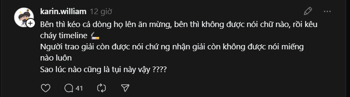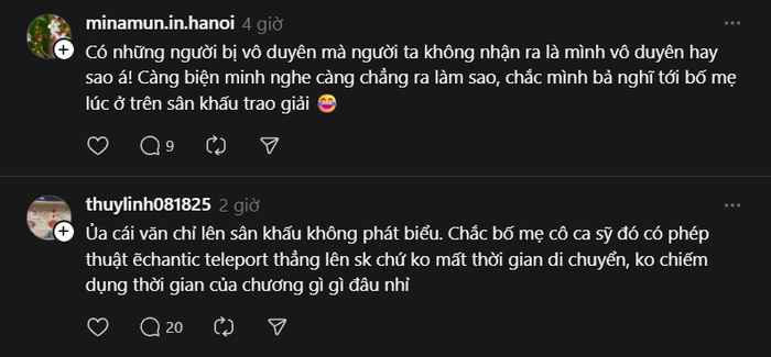 Trong khoảnh khắc xúc động, Hòa Minzy mời bố mẹ cùng lên sân khấu chia sẻ niềm hạnh phúc. Hành động xuất phát từ tình cảm gia đình giản dị này lại trở thành nguyên nhân dẫn đến sự cố “vỡ kịch bản”, khiến chương trình buộc phải rút ngắn hoặc cắt bỏ phần phát biểu của một số nghệ sĩ khác. Ngay sau đó, mạng xã hội lập tức dậy sóng với nhiều ý kiến trái chiều. Trên Threads, không ít bình luận cho rằng nữ ca sĩ thiếu tinh tế, không kiểm soát được cảm xúc và chưa đặt yếu tố chuyên nghiệp của một lễ trao giải lên hàng đầu. Thậm chí, có quan điểm quy kết sự việc cho việc “EQ thấp”, khiến hình ảnh vốn được yêu mến của Hòa Minzy ít nhiều bị ảnh hưởng.