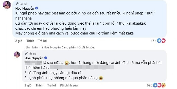 Bên cạnh những lời chúc phúc từ người hâm mộ sau khi công khai loạt ảnh đi du lịch, một số khán giả cho rằng Hòa Minzy nên tiết chế việc khoe ảnh đời tư. Đáp lại quan điểm này, nữ ca sĩ chia sẻ: "Hơn một tháng mới đăng cái ảnh đi chơi mà vẫn phải tiết chế thêm hả chị? Em có đăng ảnh nhạy cảm gì đâu. Em hạnh phúc nhẹ nhàng mà?".