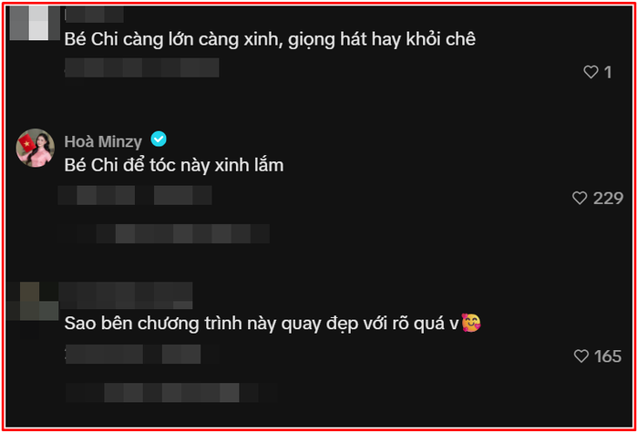 Bên dưới đoạn clip, Hòa Minzy đã để lại bình luận ngắn gọn nhưng gây chú ý: "Bé Chi để tóc này xinh lắm". Câu nói tuy đơn giản nhưng thể hiện sự động viên, khích lệ đàn em. Khoảnh khắc tương tác ấy lan tỏa mạnh mẽ trên mạng xã hội, khiến nhiều người cảm nhận được tình cảm chân thành giữa hai nghệ sĩ - điều hiếm thấy giữa môi trường giải trí cạnh tranh.