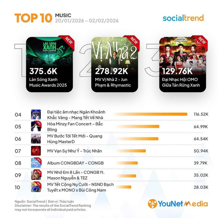 Bảng xếp hạng tuần này cũng phản ánh xu hướng người dùng mạng xã hội không chỉ quan tâm đến bài hát hay MV mới, mà còn chú ý nhiều hơn đến trải nghiệm tổng thể của nghệ sĩ, bao gồm sân khấu, ý tưởng dàn dựng và cách nội dung được lan tỏa sau sự kiện.