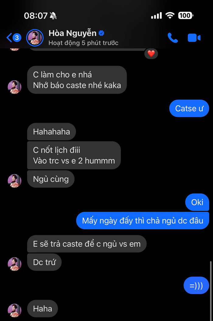 Trong đoạn tin nhắn được công khai, Hòa Minzy là người chủ động nhắn tin nhờ đàn chị hỗ trợ về công việc. Sau đó, nữ ca sĩ bất ngờ đề nghị Phí Linh vào sớm hai ngày và không quên trêu đùa bằng câu nói: "Em sẽ trả cát-sê để chị ngủ cùng em. Được chứ?".