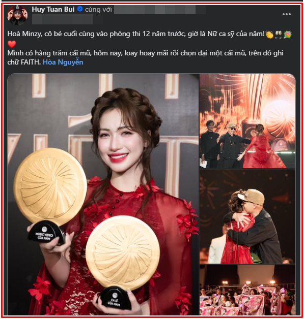 Kèm theo bài đăng, nam nhạc sĩ viết dòng chú thích ngắn gọn nhưng đầy cảm xúc: "Hòa Minzy, cô bé cuối cùng vào phòng thi 12 năm trước, giờ là Nữ ca sĩ của năm. Mình có hàng trăm cái mũ, hôm nay loay hoay mãi rồi chọn đại một cái mũ, trên đó ghi chữ FAITH (Tạm dịch: Tin tưởng tuyệt đối )". Câu chữ tưởng chừng giản dị nhưng lại chứa đựng nhiều tầng ý nghĩa, như một lời khẳng định về niềm tin mà Huy Tuấn đã dành cho Hòa Minzy suốt chặng đường dài, từ những ngày đầu chập chững bước vào nghề cho đến khi được vinh danh trên sân khấu lớn.