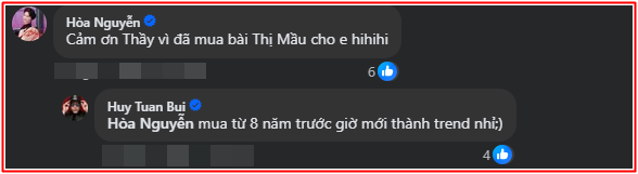 Dưới bài viết của Huy Tuấn, Hòa Minzy bất ngờ để lại một bình luận tiết lộ "bí mật" khiến nhiều người không khỏi ngạc nhiên: "Cảm ơn Thầy vì đã mua bài Thị Mầu cho em hihi". Nam nhạc sĩ lập tức phản hồi: "Mua từ 8 năm trước, giờ mới thành trend nhỉ". Màn đối đáp ngắn gọn nhưng lại mở ra một câu chuyện hậu trường thú vị về ca khúc từng gây sốt trên các nền tảng mạng xã hội trong thời gian qua.