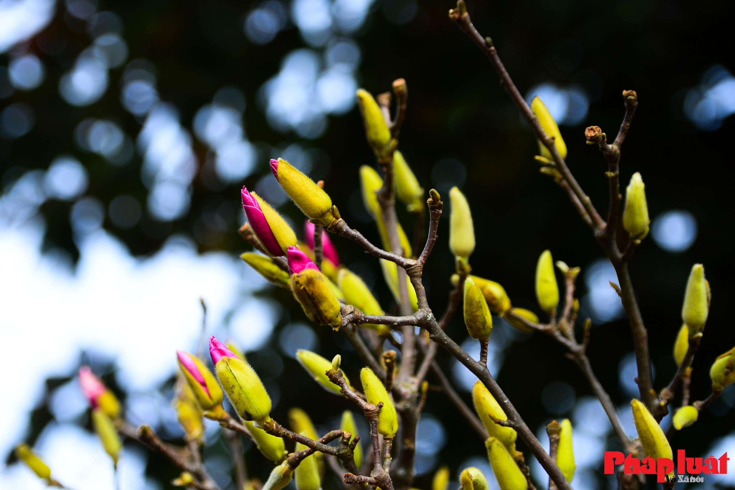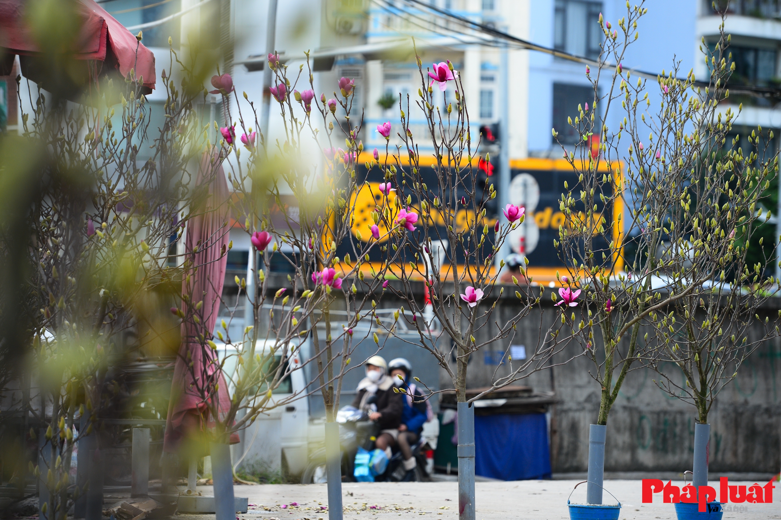 Hoa mộc lan xuất hiện với nhiều màu sắc như trắng, hồng, tím, được bày thành từng cành lớn, tạo điểm nhấn nổi bật giữa không gian chợ hoa cuối năm.