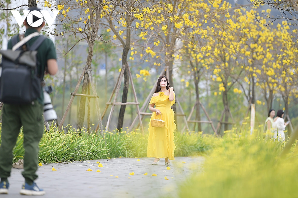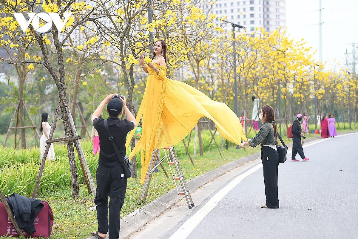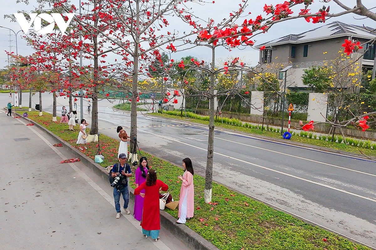 ...cũng bởi vậy, bên cạnh những người dân chụp ảnh check-in ghi lại kỷ niệm cho bản thân, đường hoa phong linh, hoa gạo Dương Nội còn là điểm đến của nhiều nhiếp ảnh gia Thủ đô.