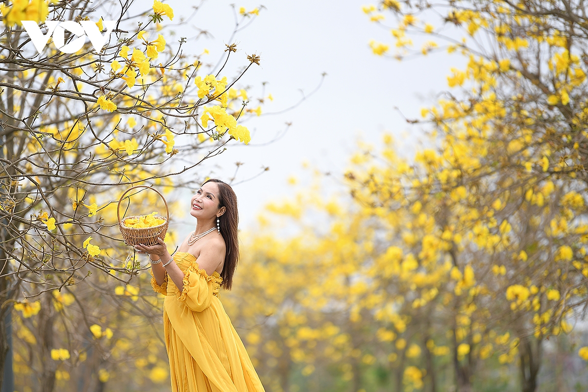 Cung đường dài hơn 500 mét, chỉ trồng hai loại cây cùng ra hoa cùng vào tháng 3 với hai sắc hoa đỏ, vàng rực rỡ. Từ xa, cả đoạn đường nổi bật như được phủ một lớp ánh vàng rực rỡ dưới nắng, xen giữa những tán phong linh là hàng hoa gạo đang trổ bông đỏ thắm, tạo nên sự giao thoa màu sắc đầy ấn tượng.