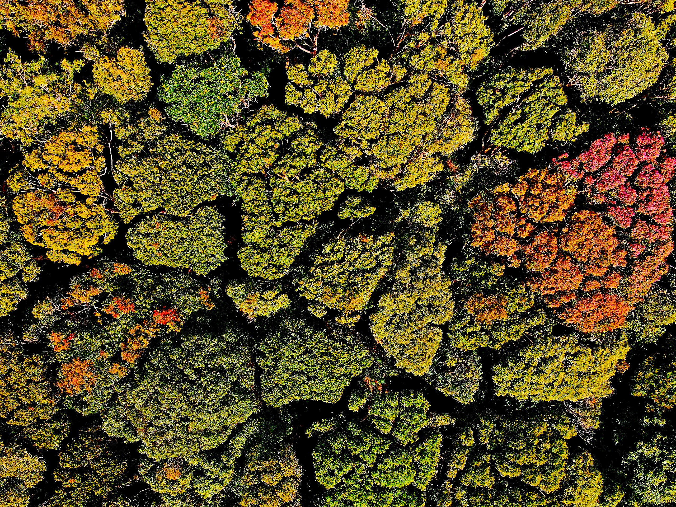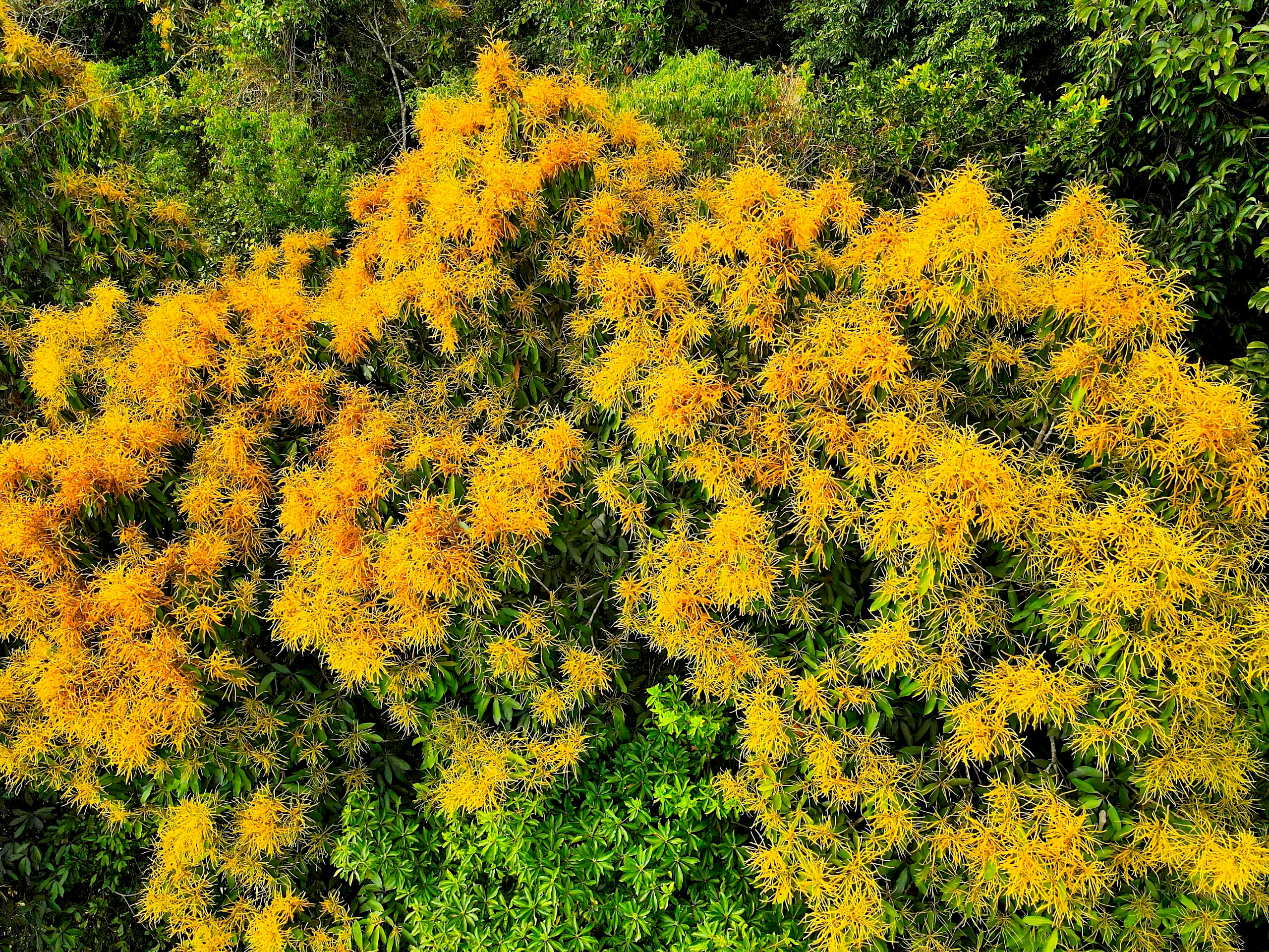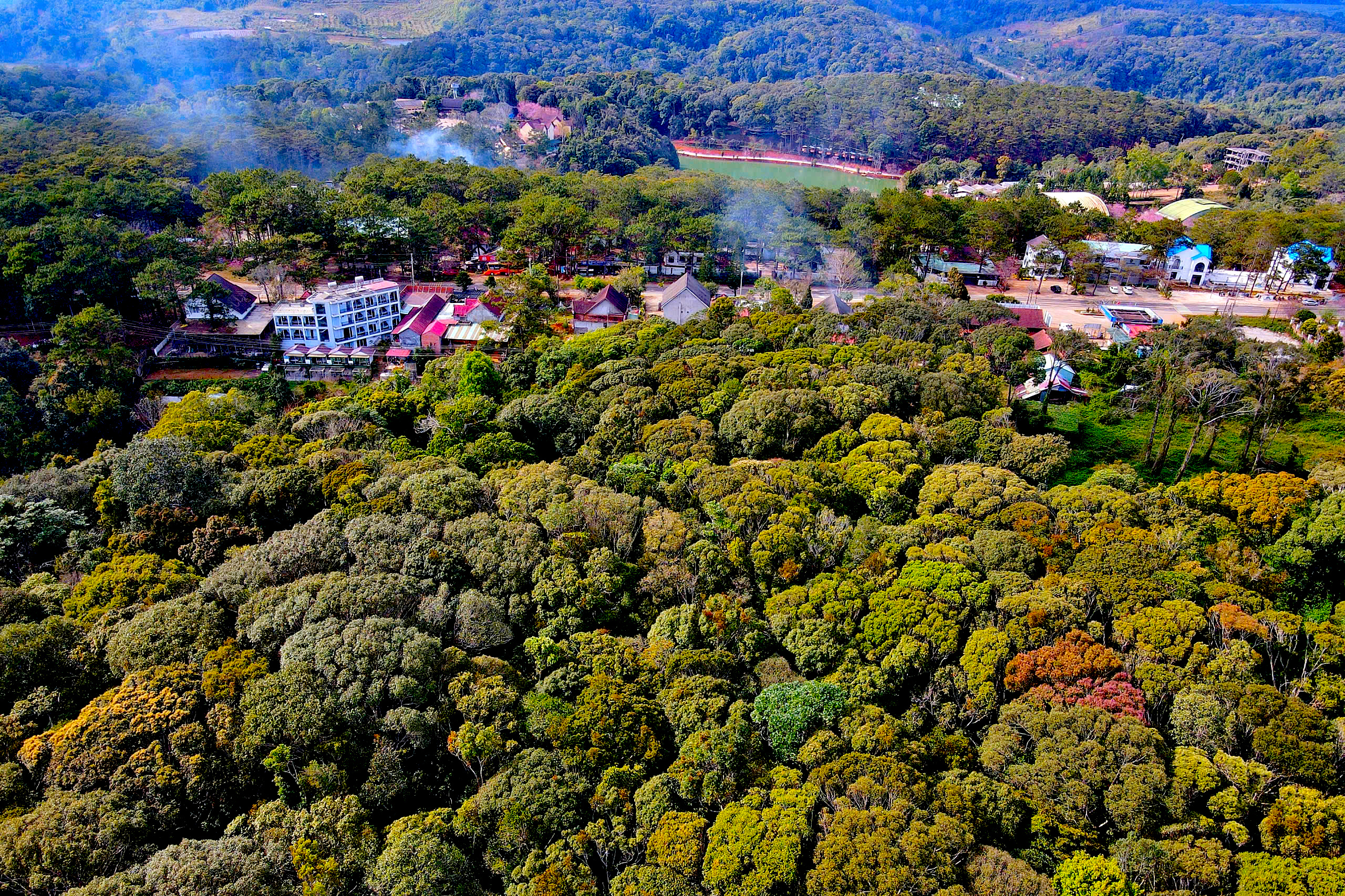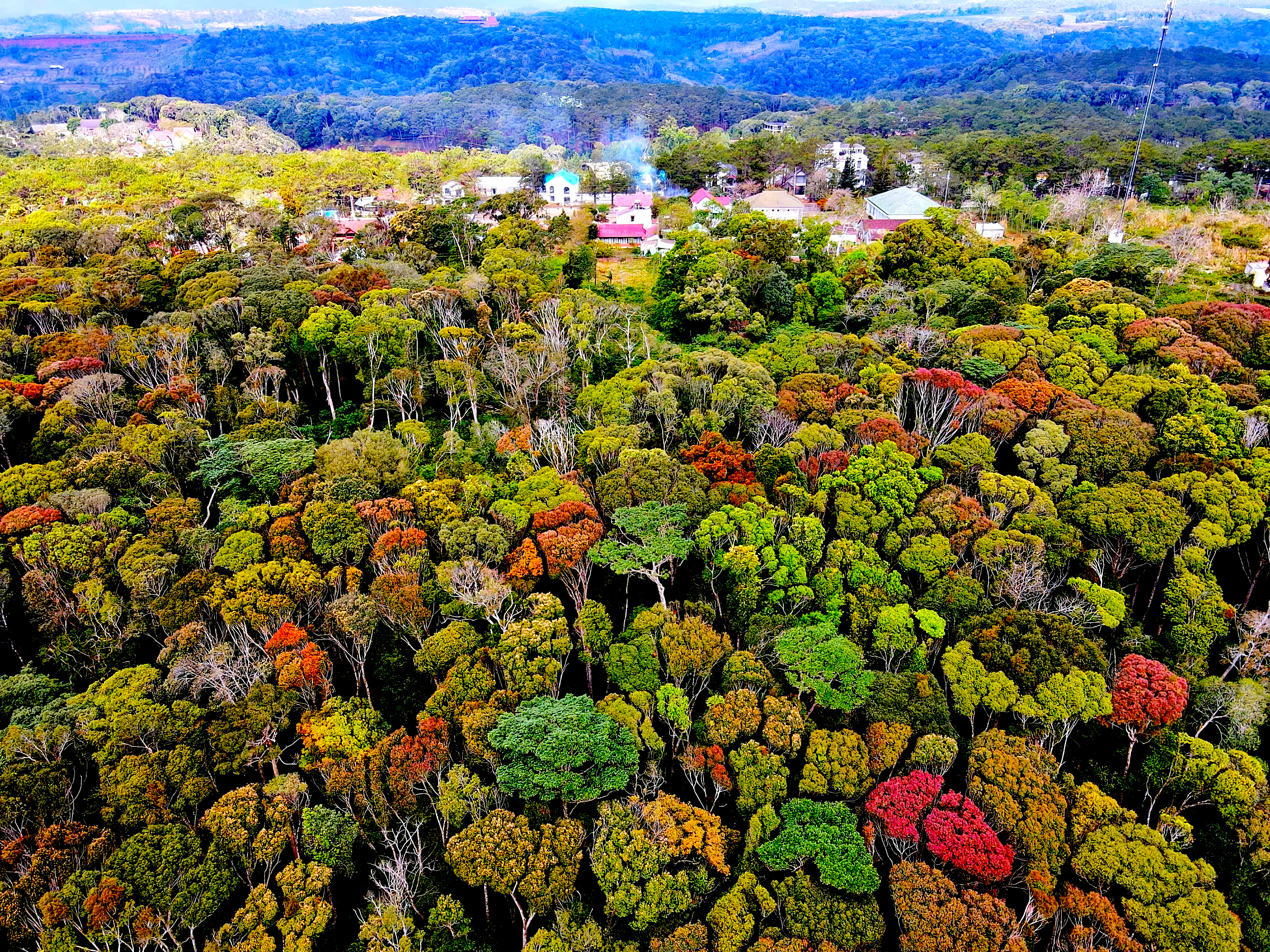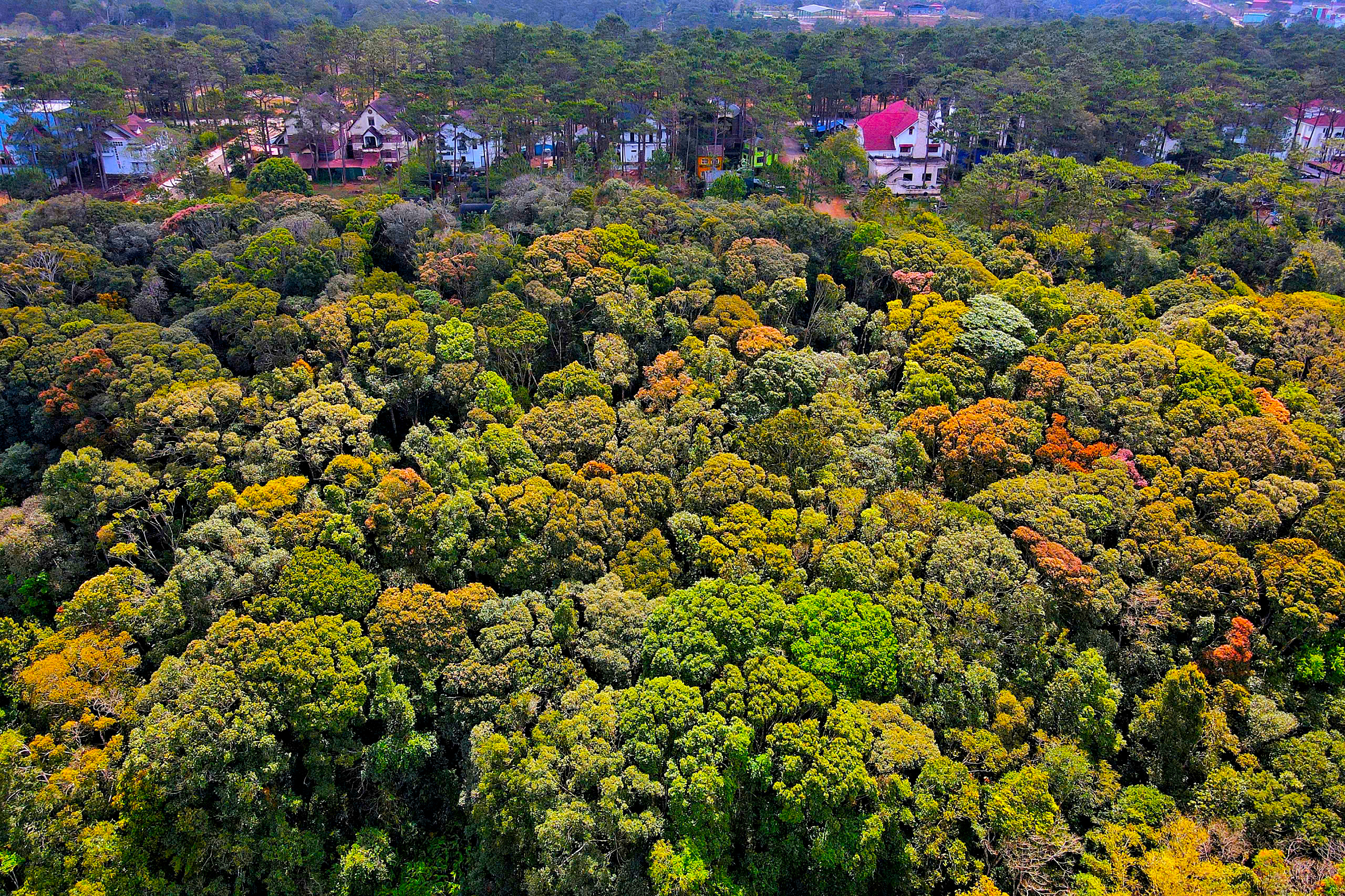 Giữa núi rừng, những mầm non xanh biếc vươn mình mạnh mẽ, đại ngàn nhờ đó càng thêm rạng rỡ, căng tràn sức sống. Từ trên cao nhìn xuống, các mảng hoa xen lẫn sắc xanh của tán lá non tạo nên bức tranh thiên nhiên sinh động, tươi mới, ngập tràn sắc xuân.