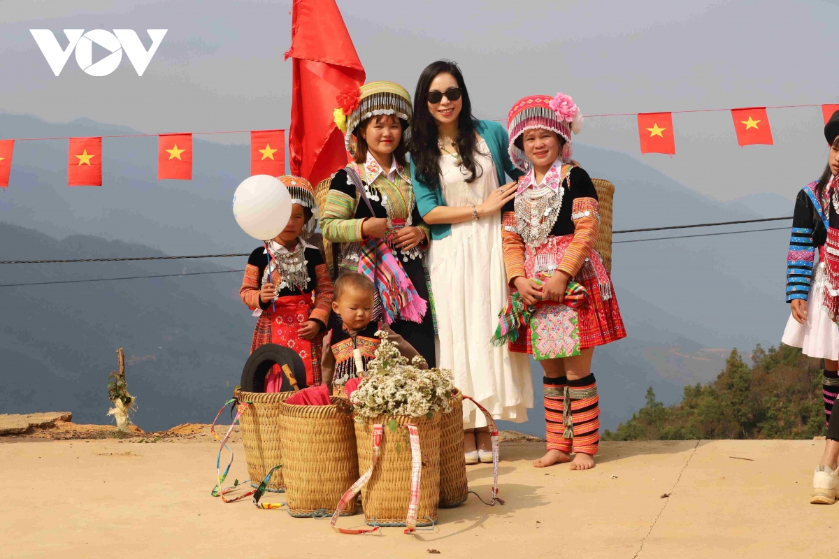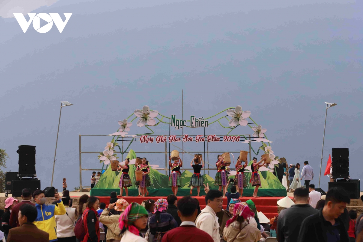 Du khách thích thú check in tại bản Nậm Nghiệp, nơi diễn ra Ngày hội Hoa Sơn Tra lần thứ IV năm 2026.