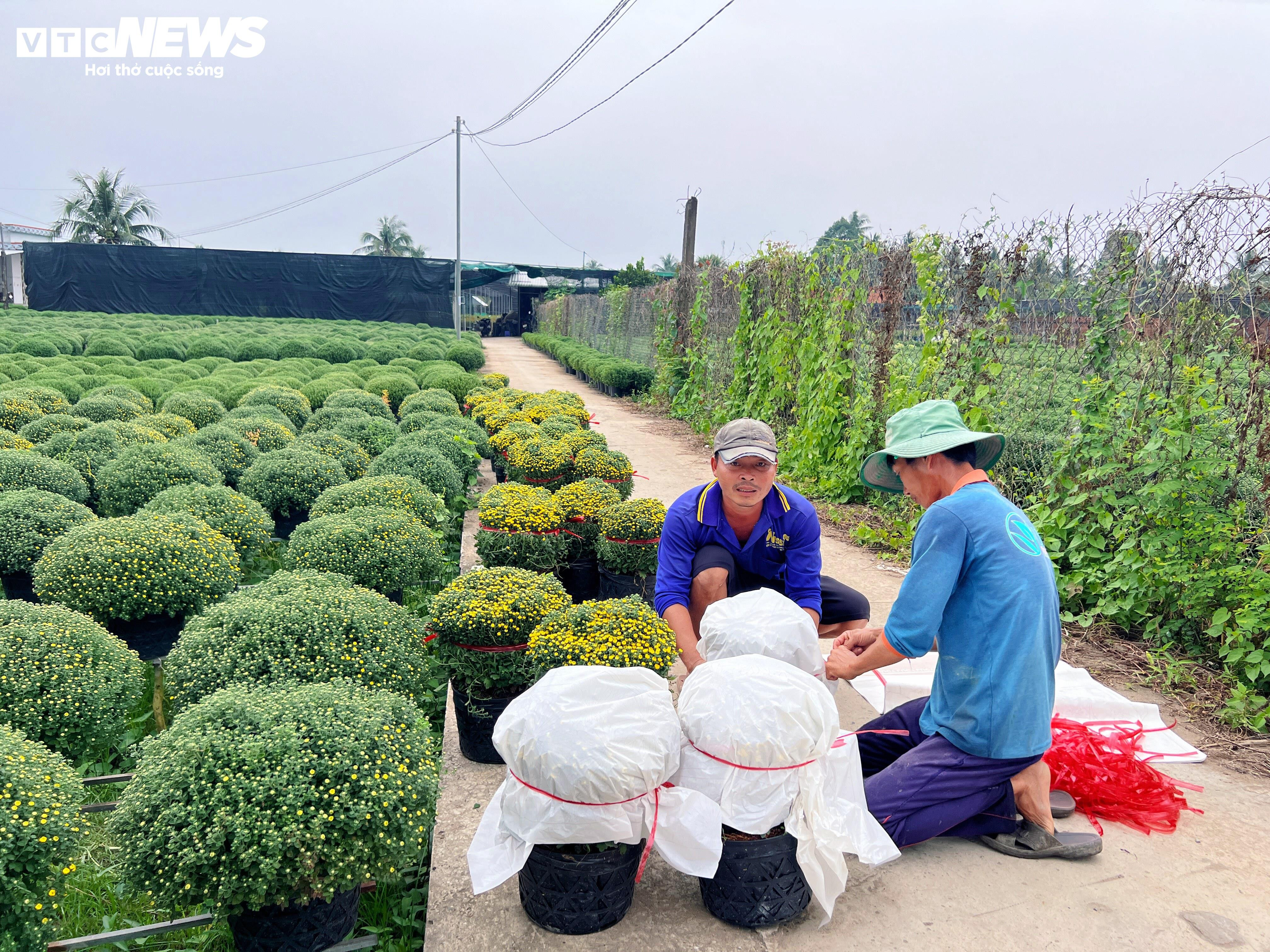 Tại xã Chợ Lách, tỉnh Vĩnh Long, chị Kim Hoa, một nhà vườn có nhiều năm gắn bó với nghề trồng hoa kiểng, cho biết năm nay gia đình chị và các anh chị em trồng hơn 10.000 chậu cúc mâm xôi. Trong đó, riêng vườn nhà chị chiếm khoảng 6.000 - 7.000 chậu, số còn lại do anh chị trong gia đình trồng thêm.