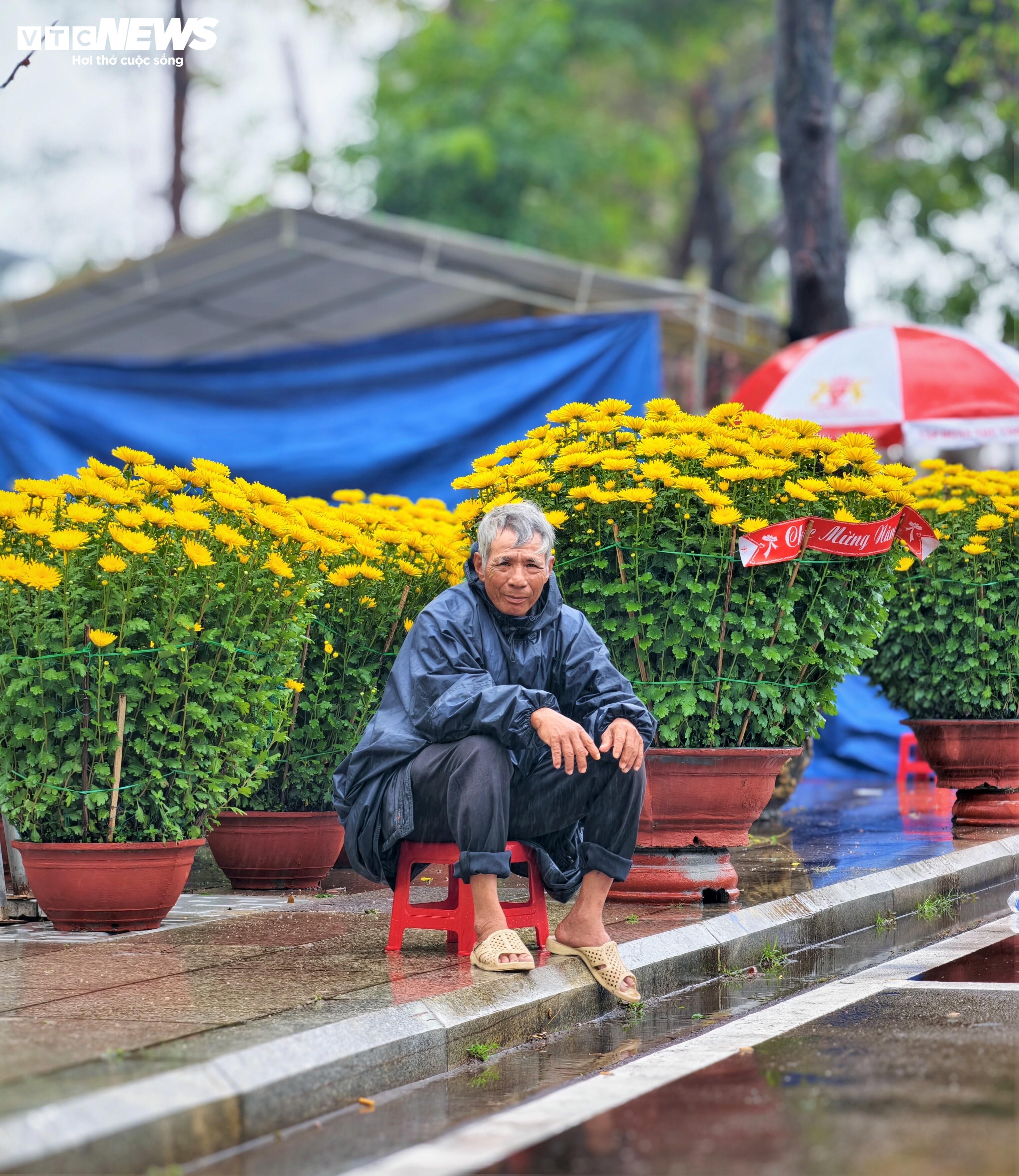 Tiểu thương co ro trong lớp áo mưa, kiên nhẫn ngồi chờ khách ghé mua hoa Tết.