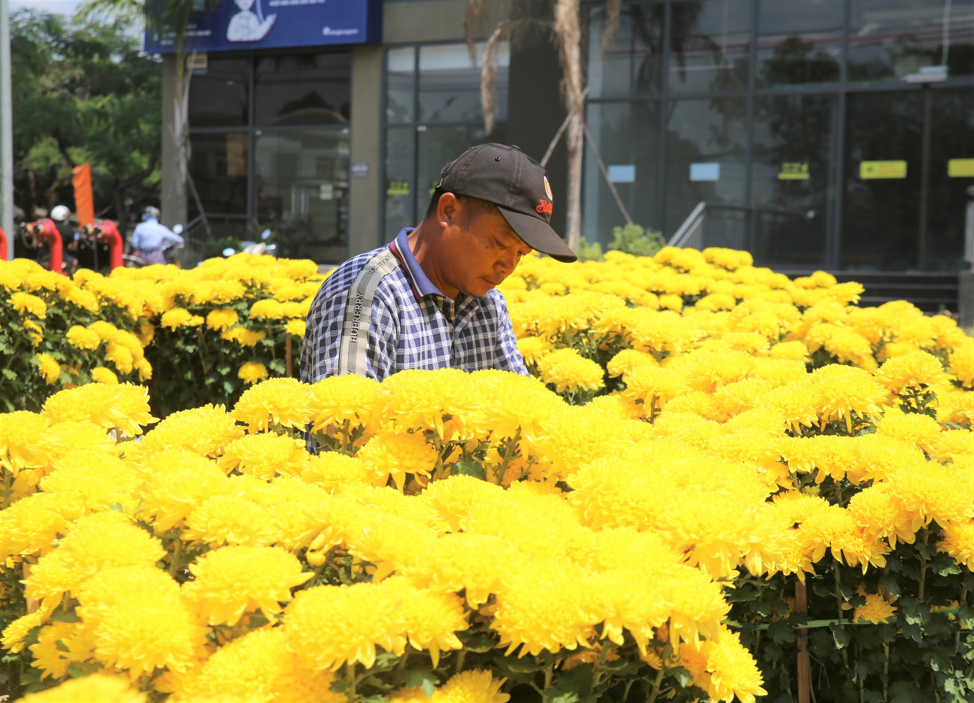 Nhà vườn tranh thủ buổi trưa vắng khách tưới cho hoa, cây cảnh. Các tiểu thương cho biết, thời tiết năm nay khá ổn định, hoa phát triển đều, màu sắc đẹp. Giá cúc đại đóa từ 1,5 – 5 triệu đồng/cặp, đường kính chậu từ 60 - 100cm. Có những cặp cúc cao trên 1,2m, giá khoảng 7 triệu đồng/cặp.