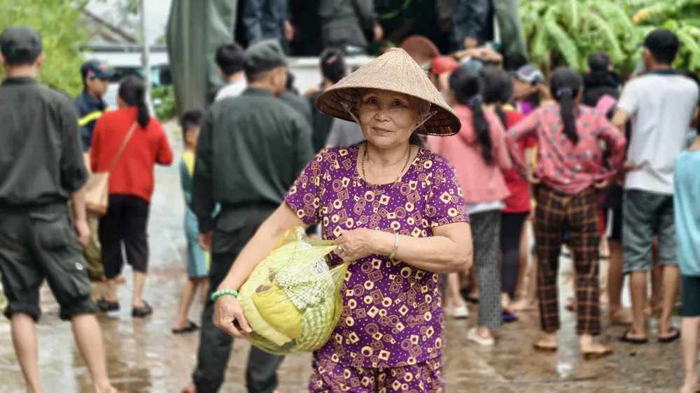 Bà nhớ lại đêm nước dâng cao: “Nước lên tới cổ, tôi với chồng leo lên trên bệ tủ đứng dầm mình trong nước lũ. Không có gì để ăn uống được. Cần nhất là gạo với mì”.
