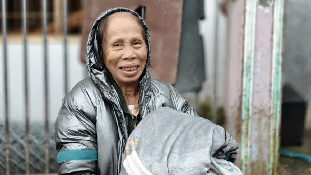 Bà An vui mừng khi nhận được chiếc chăn ấm sau nhiều ngày thiếu thốn.
