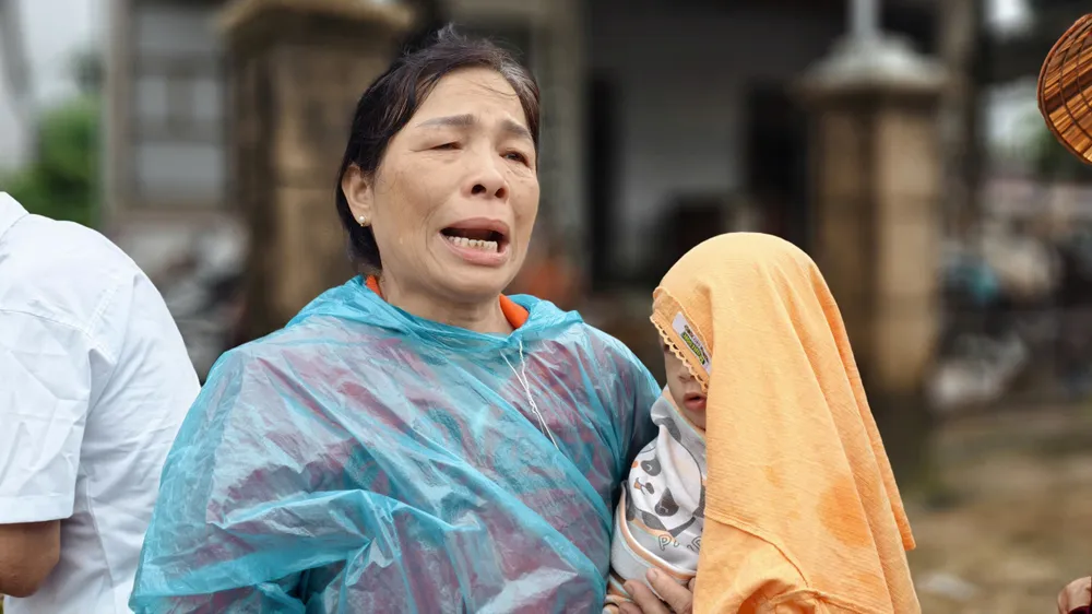 Bà Nguyễn Thị Thảo (60 tuổi, thôn Mỹ Trung) đang ôm đứa cháu nhỏ độ 1 tuổi, bật khóc thành tiếng vì nhà bị ngập toàn bộ, tài sản chẳng còn gì ngoài mấy bộ quần áo ướt sũng vắt tạm ngoài hiên.