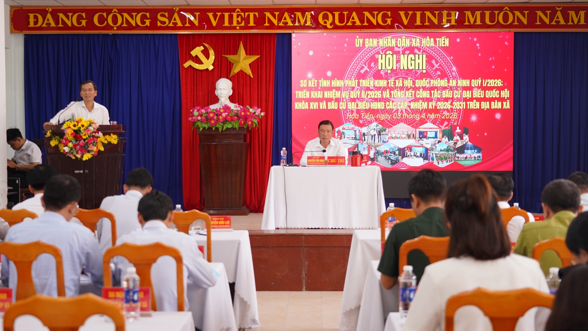 Công tác bầu cử đại biểu Quốc hội khóa XVI và đại biểu HĐND các cấp nhiệm kỳ 2026 - 2031 trên địa bàn xã Hòa Tiến được tổ chức nghiêm túc, đúng quy định, bảo đảm dân chủ, an toàn, đạt tỷ lệ 100% cử tri đi bỏ phiếu và bầu đủ 23 đại biểu HĐND xã nhiệm kỳ 2026 - 2031.
