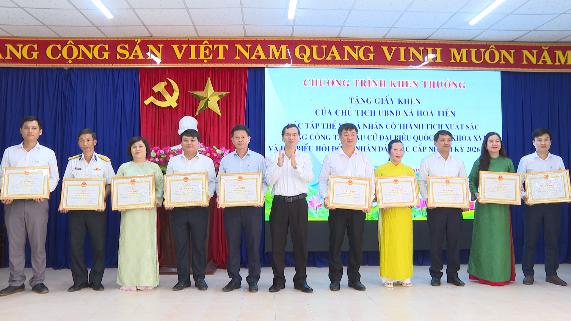 Dịp này, UBND xã Hòa Tiến khen thưởng cho 35 tập thể và 97 cá nhân có thành tích xuất sắc trong công tác bầu cử đại biểu Quốc hội khóa XVI và đại biểu HĐND các cấp nhiệm kỳ 2026 - 2031.