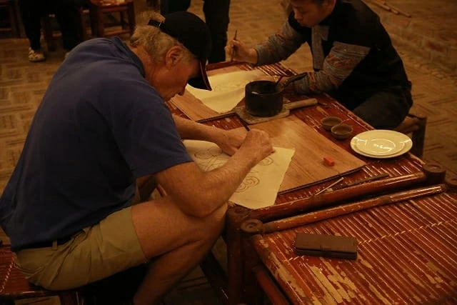 Du khách nước ngoài trải nghiệm vẽ tay các họa tiết truyền thống của người H’Mông. (Ảnh: Khánh Linh)