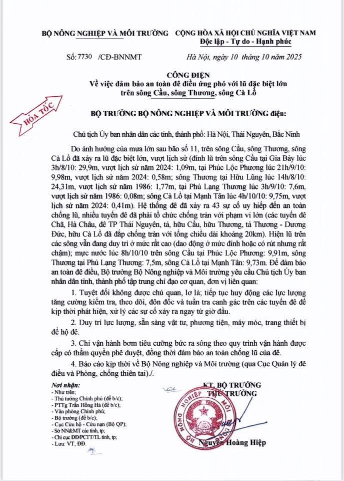 Theo TTXVN, Bộ trưởng Bộ Nông nghiệp và Môi trường đã có công điện gửi Chủ tịch UBND các tỉnh, thành phố: Hà Nội, Thái Nguyên, Bắc Ninh về việc đảm bảo an toàn đê điều ứng phó với lũ đặc biệt lớn trên sông Cầu, sông Thương, sông Cà Lồ.
