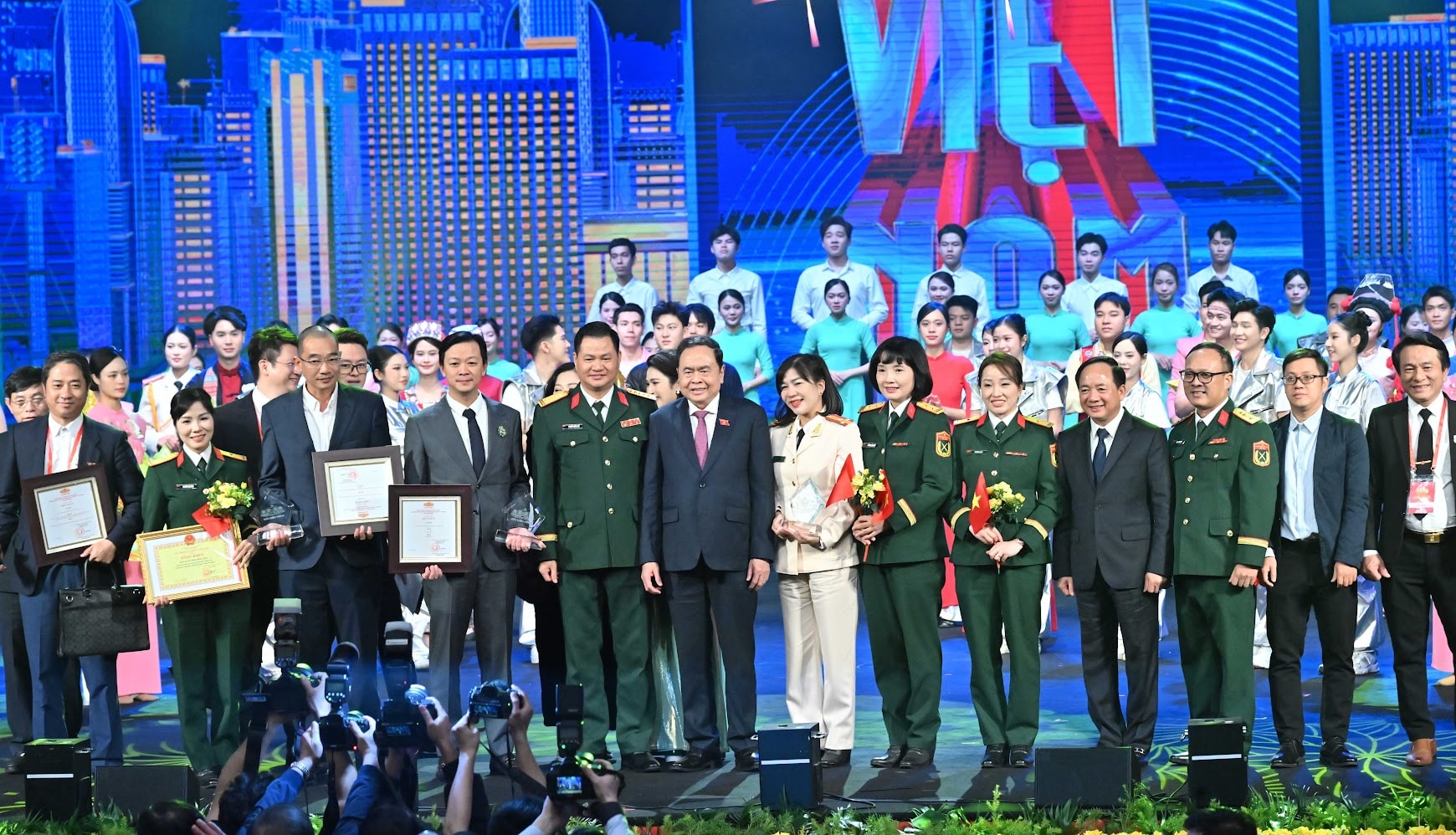 Chủ tịch Quốc hội Trần Thanh Mẫn cùng các tác giả, nhóm tác giả tại Lễ trao giải Diên Hồng lần thứ tư. Ảnh: Quang Khánh