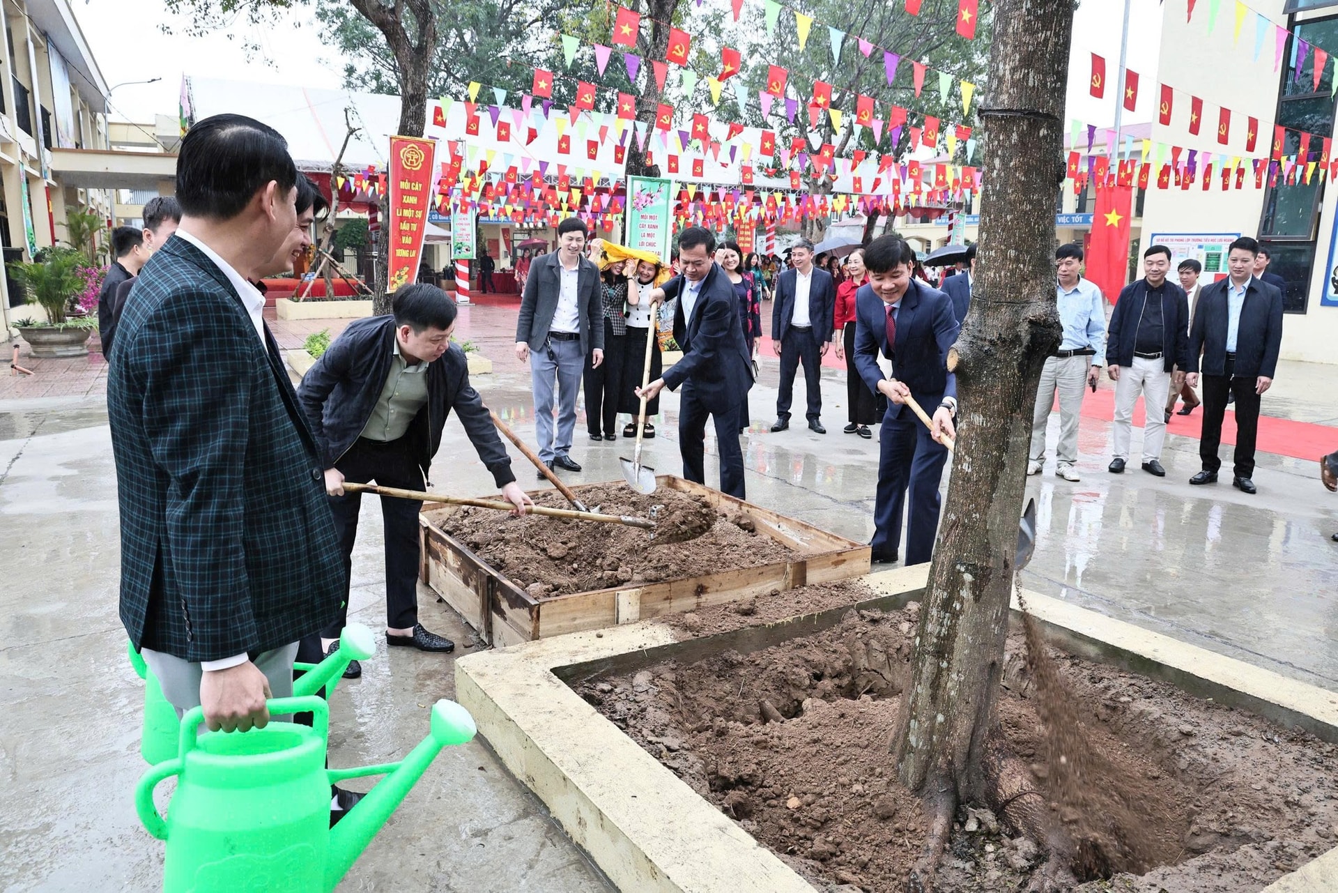 Lãnh đạo xã Hòa Xá tham gia trồng cây đầu xuân tại lễ phát động. Ảnh: Huy Nguyện