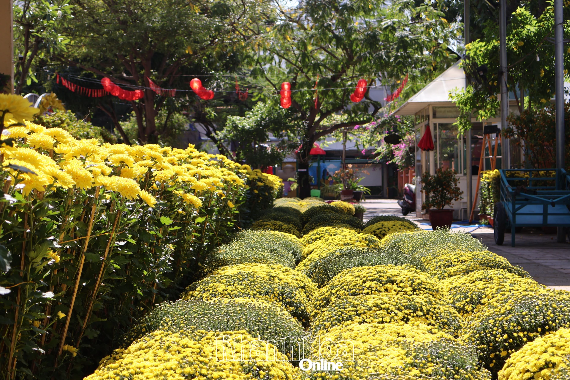 Khu vực trước Trường THCS Thái Nguyên, “phố lồng đèn” đã bắt đầu hoạt động với hơn 10 hộ kinh doanh. Nơi đây nổi bật với hàng trăm loại đèn lồng đỏ, bao lì xì, hoa mai, đào, thu hút đông đảo người dân và du khách đến tham quan, mua sắm và chụp ảnh Tết.