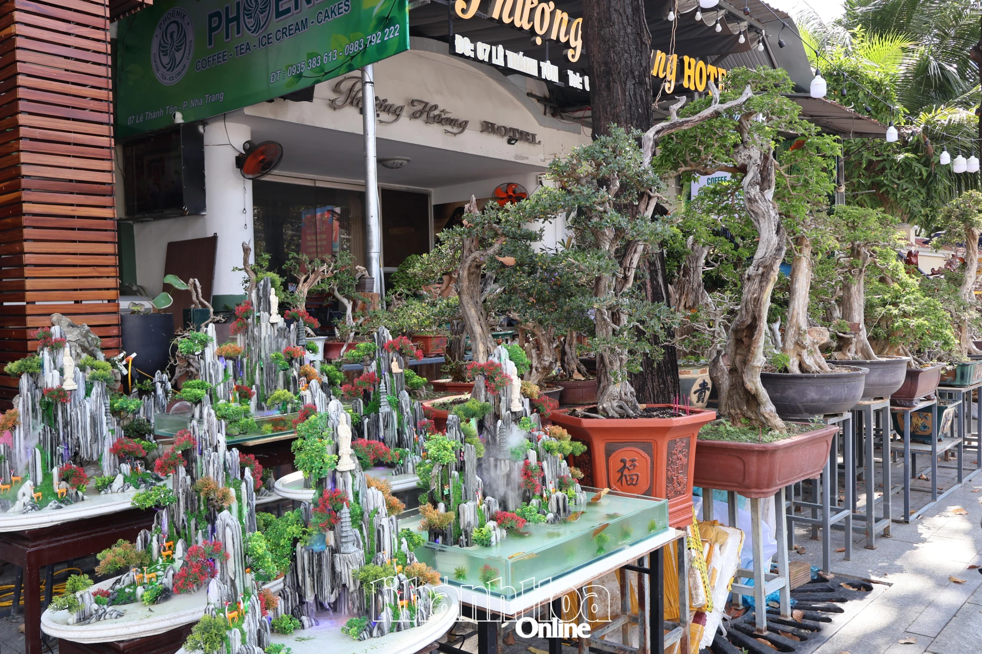 Các loại bonsai, cây cảnh bày bán dọc vỉa hè đường Lê Thánh Tôn.