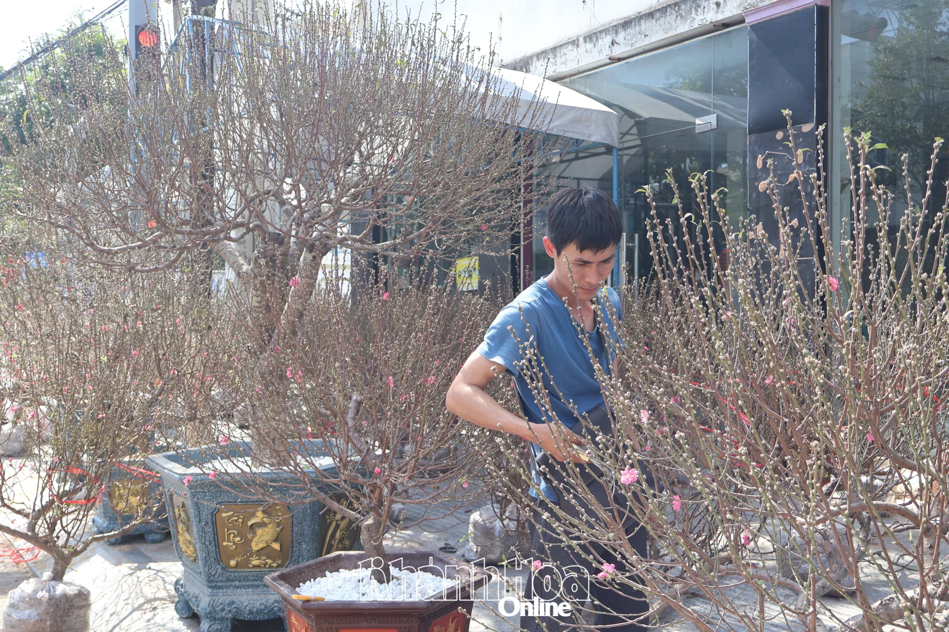 Bên đường Lê Thánh Tôn (phường Nha Trang), anh Lê Đình Huấn (TP. Hà Nội) đang tỉ mẩn cắt tỉa những cành đào từ miền Bắc mang đến Nha Trang bán trong dịp Tết này. Anh Huấn cho biết, năm nay, anh mang về Nha Trang 100 chậu đào Nhật Tân, đào bích với đầy đủ kích cỡ, giá giao động từ 600 nghìn đồng đến 6 triệu đồng/cành. ”Giá đào năm nay đắt hơn mọi năm do vừa qua, các vườn đào chịu nhiều thiệt hại bởi ảnh hưởng thiên tai. May mắn, nhờ chăm sóc tốt nên đào năm nay đẹp và nở hoa đúng dịp Tết nguyên đán”, anh Huấn chia sẻ.
