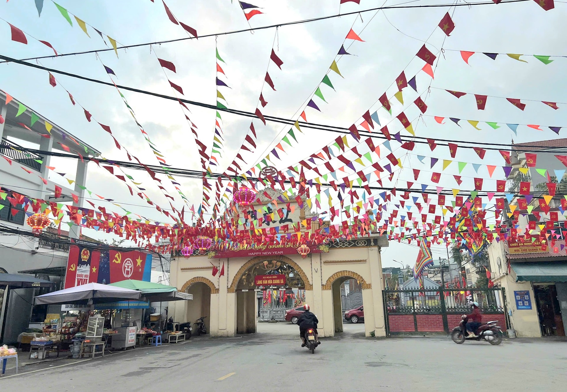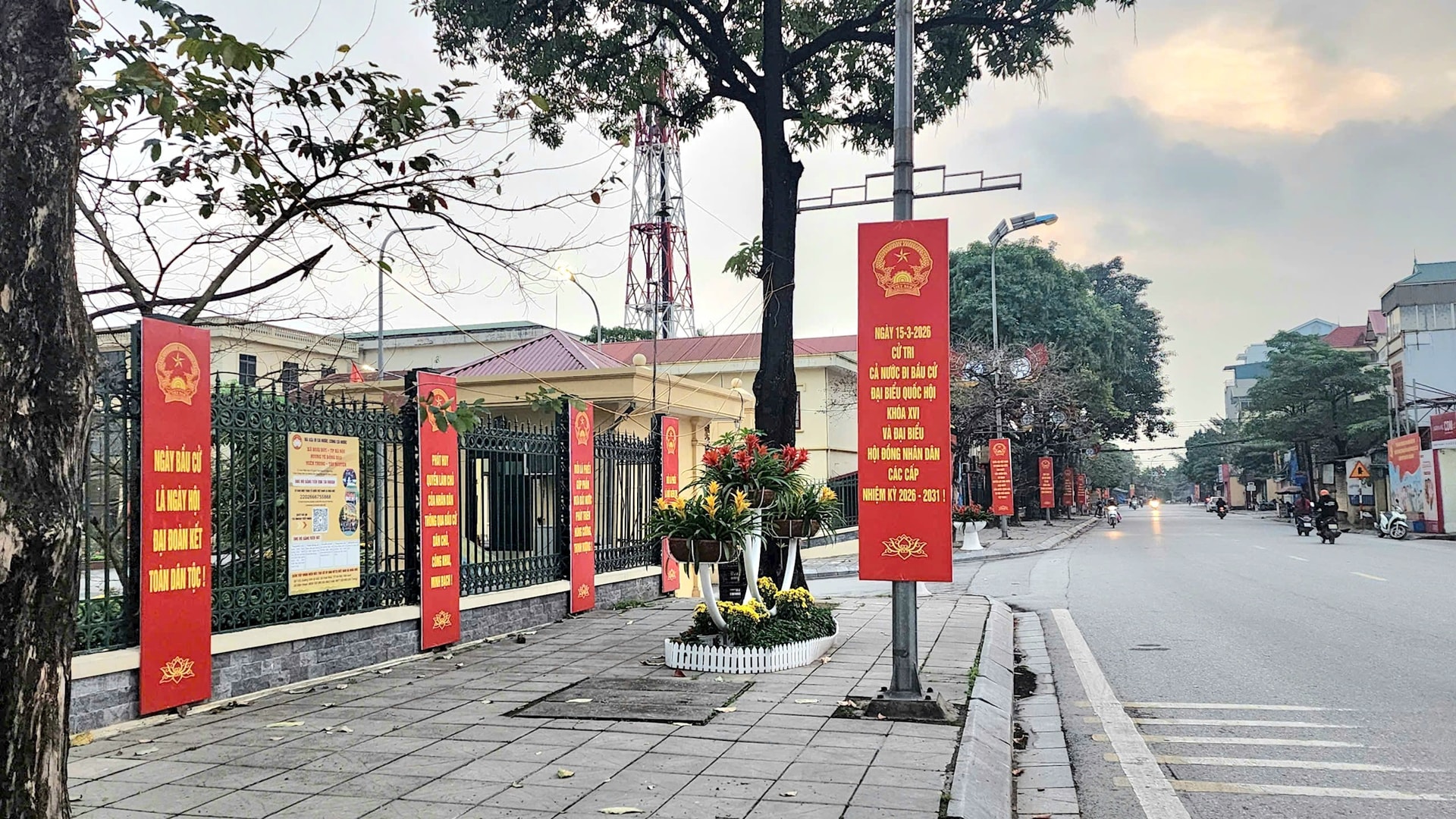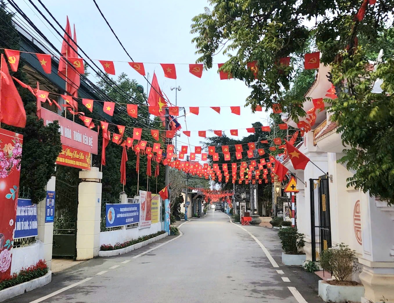 Các tuyến đường, phố ở Hoài Đức rực rỡ cờ hoa, biểu ngữ chào mừng ngày bầu cử. Ảnh: Ánh Dương