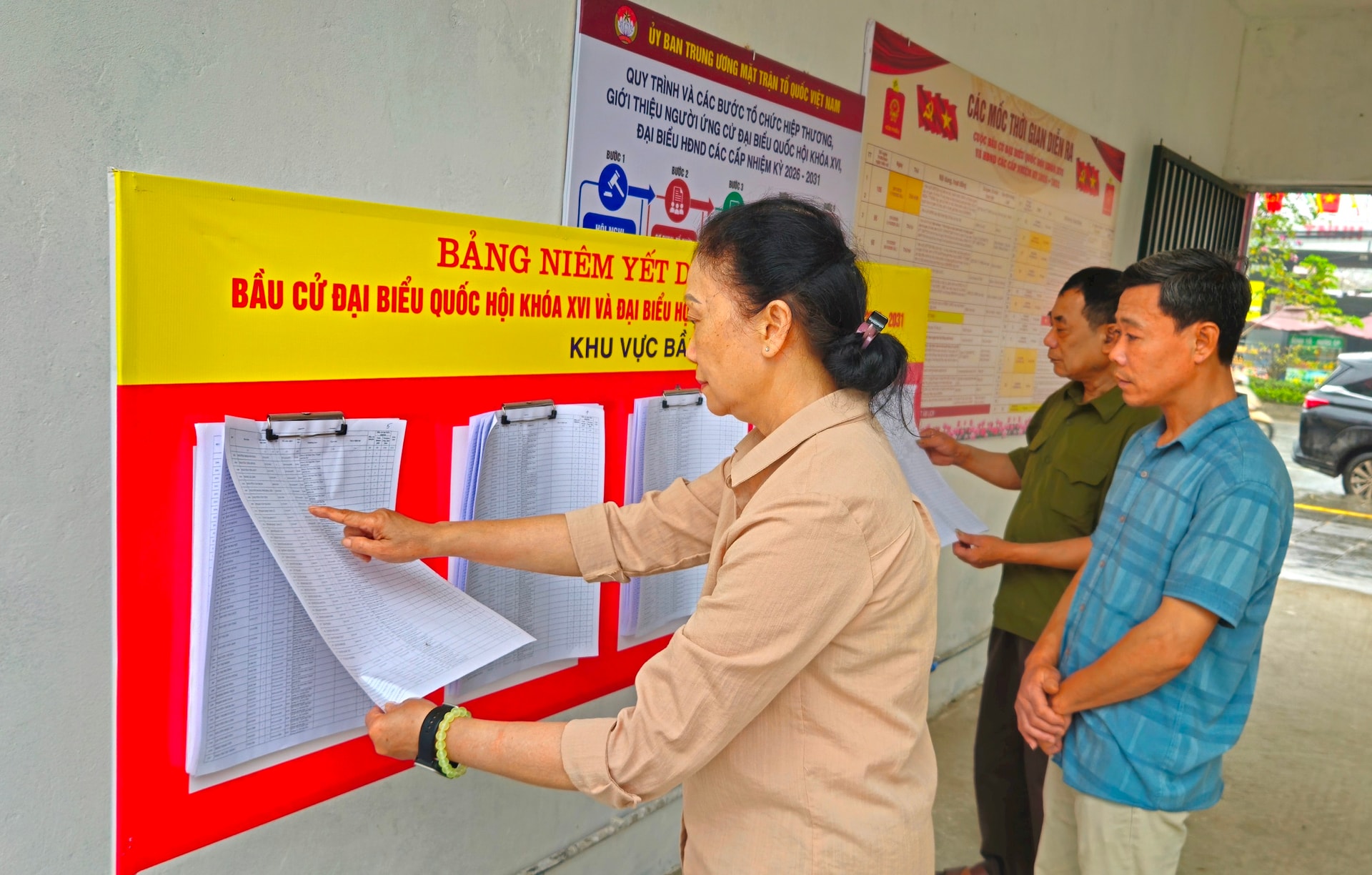 Bà Đỗ Đức Hạnh, Bí thư Chi bộ, Tổ trưởng Tổ bầu cử số 17 và thành viên tổ bầu cừ kiểm tra công tác niêm yết tại nhà văn hóa tổ dân phố. Ảnh: Vân Nga