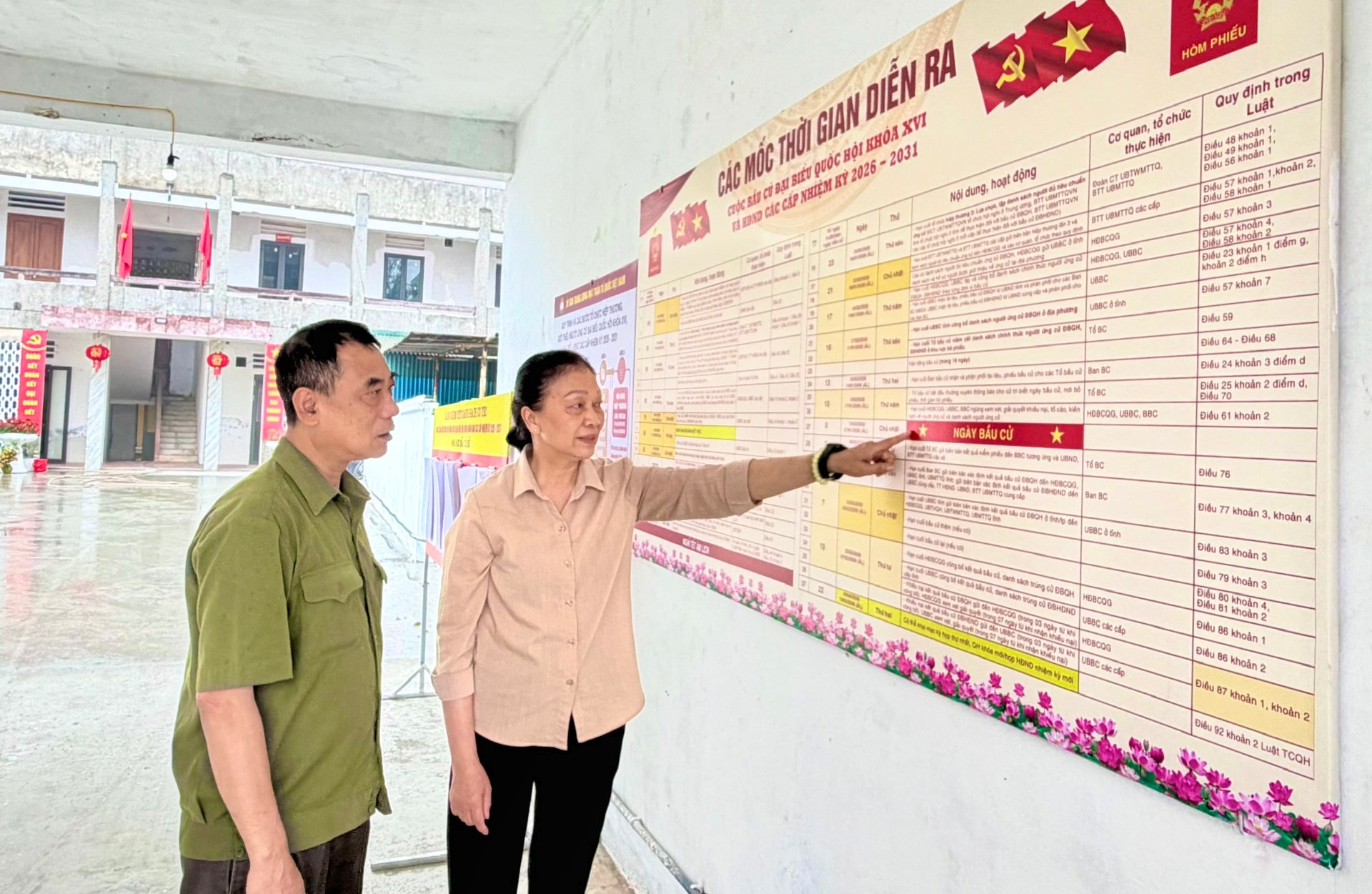 Lãnh đạo Phòng Văn hóa - Xã hội xã Hoài Đức kiểm tra công tác niêm yết danh sách cử tri, chuẩn bị hòm phiếu tại các tổ bầu cử. Ảnh: Dương Nga