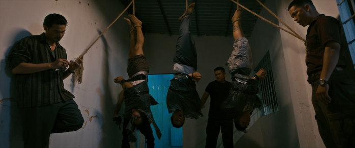 Quang Tuấn và Hoài Lâm vào vai những nạn nhân, bị treo ngược, trùm kín đầu và bị tra tấn.