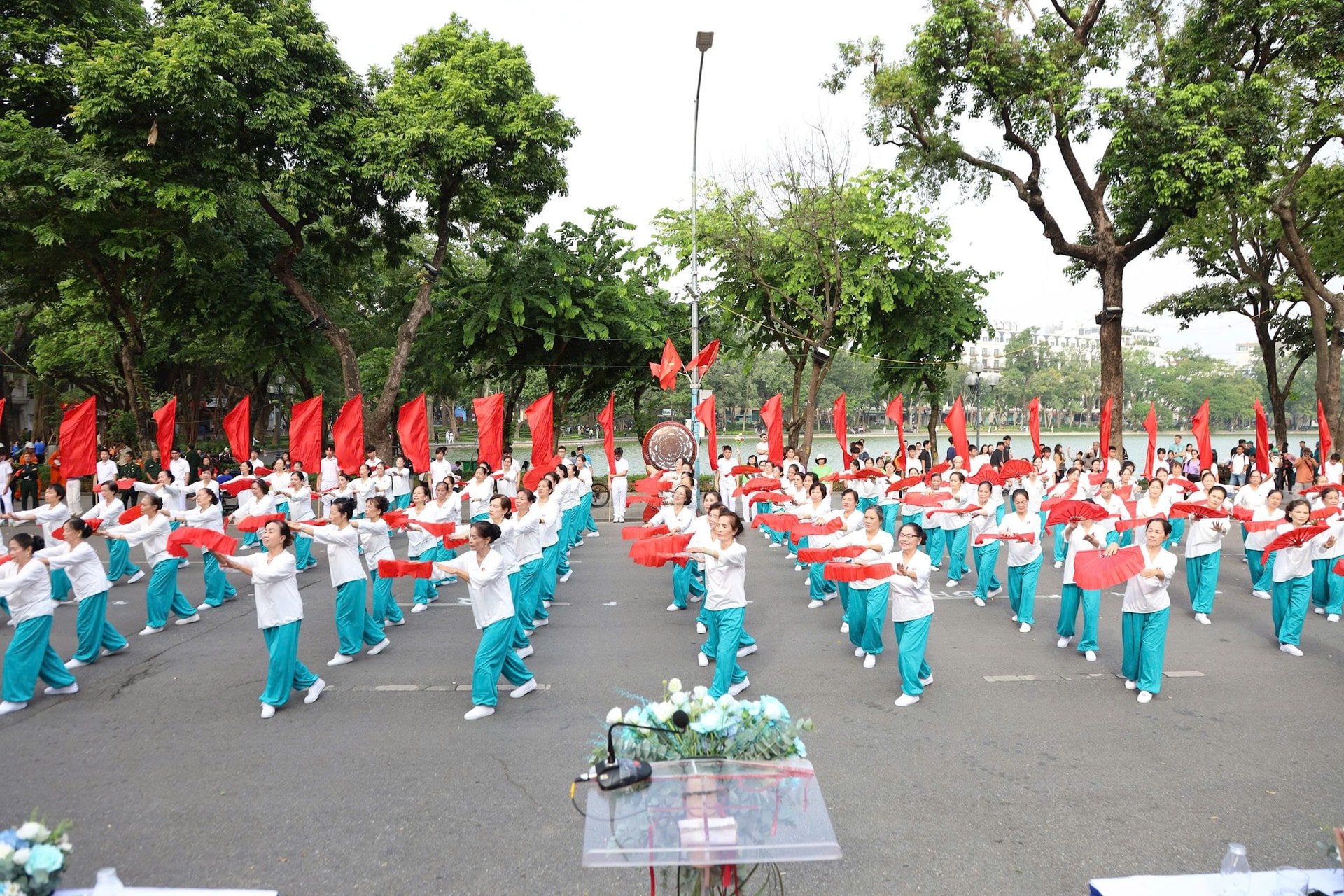 Màn đồng diễn múa quạt dưỡng sinh tại đại hội.